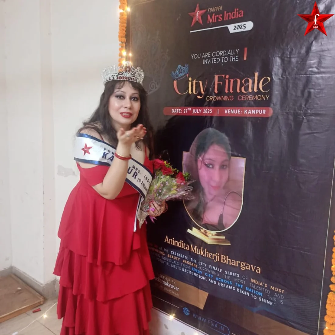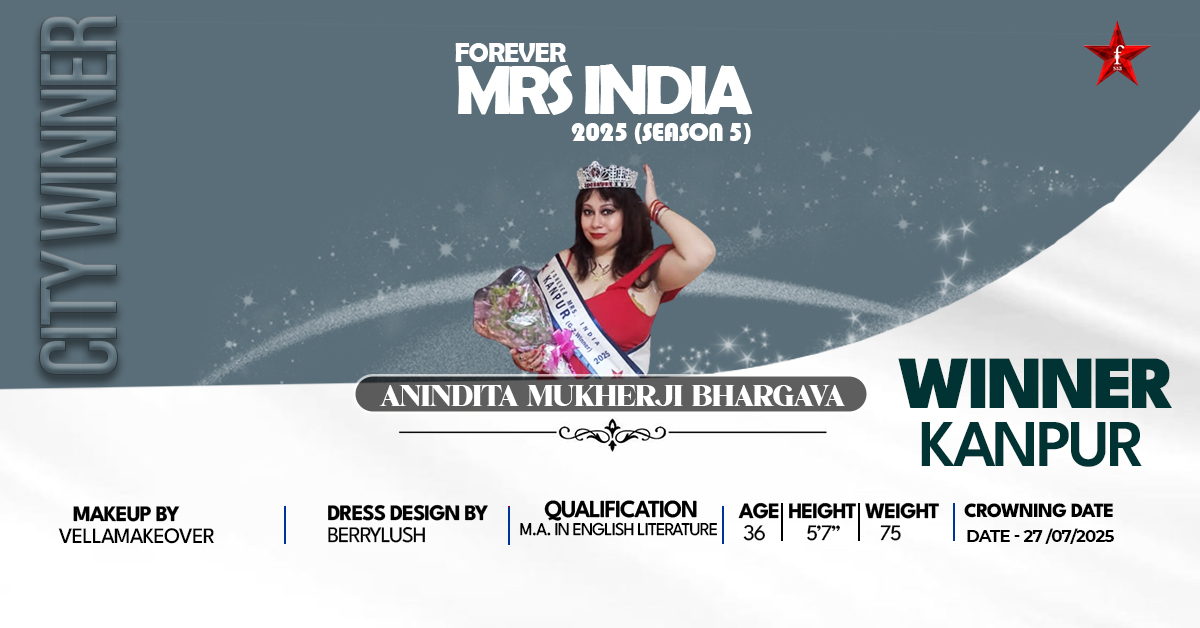 Kanpur winner Anindita Mukherji Bhargava, Mrs India 2025, was born in a culturally diverse part of Kanpur and was fascinated by performance, expression, and the development of self. The dream to grace the stage and showcase her beauty began in childhood, finding early expression through school talent shows and memorable performances, portraying Maa Durga in Maha Shakti and an Apsara in Kalidas’s classic play. Her performance in dance and drama has also been featured in the local newspaper, Amar Ujala. The fact that she was selected to be one of the Femina Miss India auditions participants and also among the over 1 to 2 lakh applicants she was selected to participate in FSIA demonstrates the facet of her talent and tenacity.