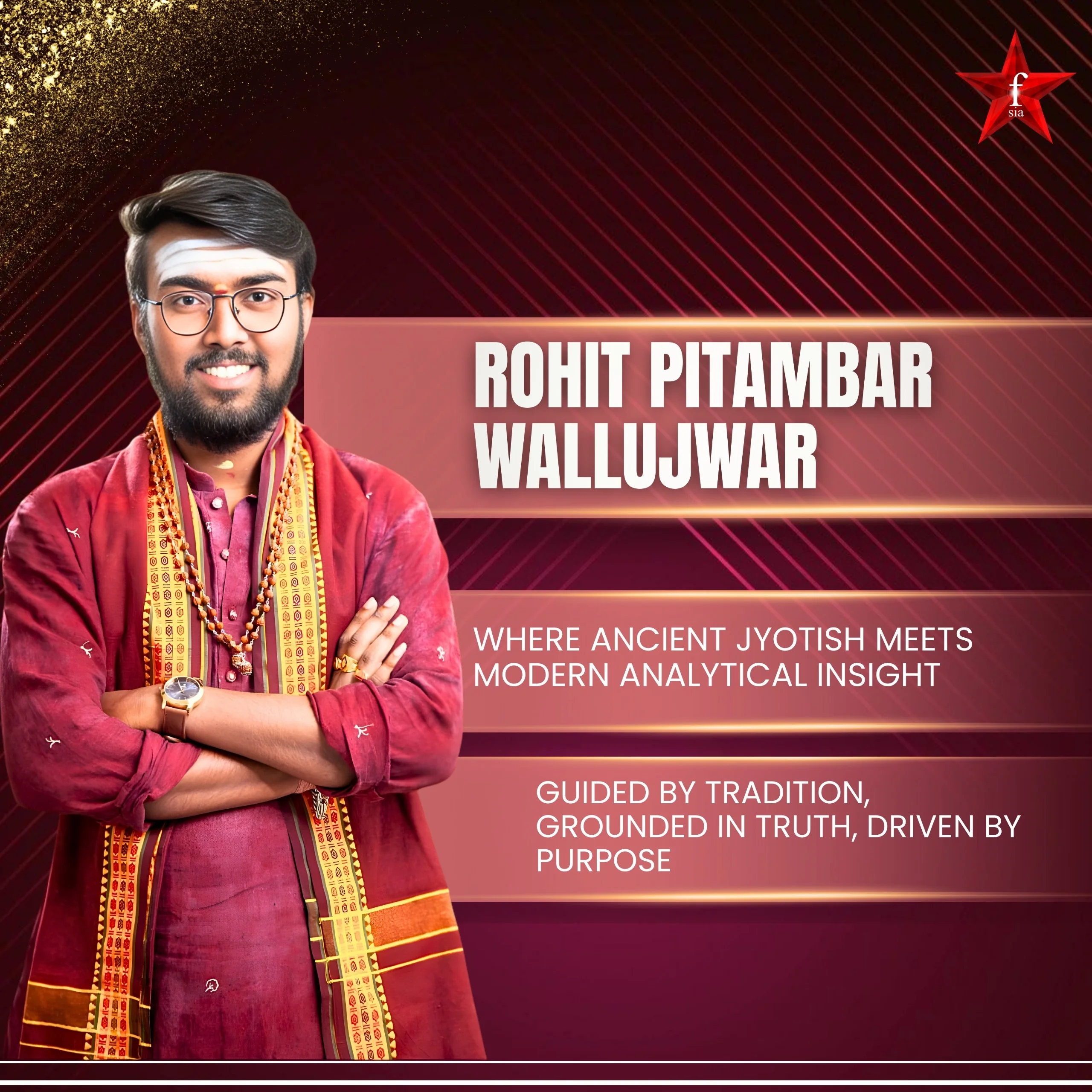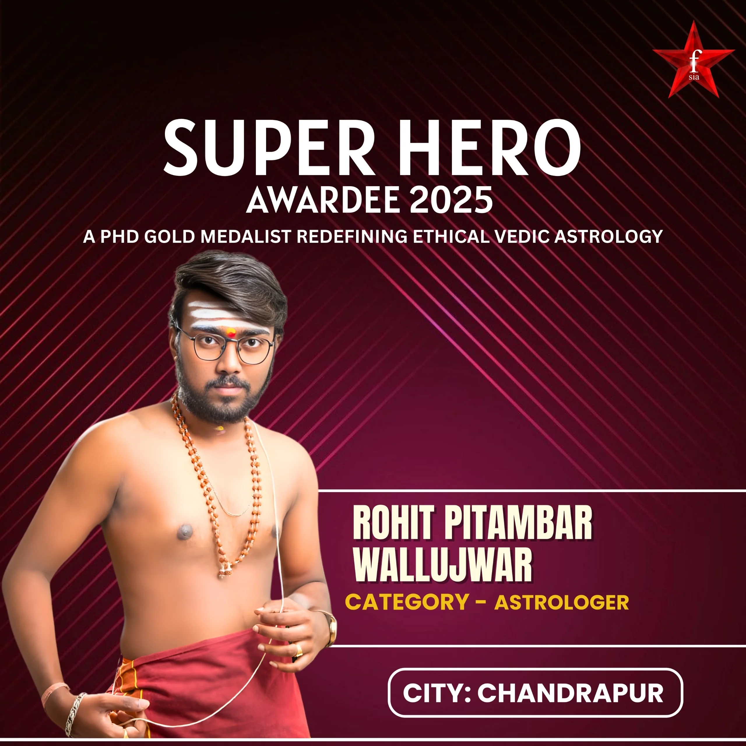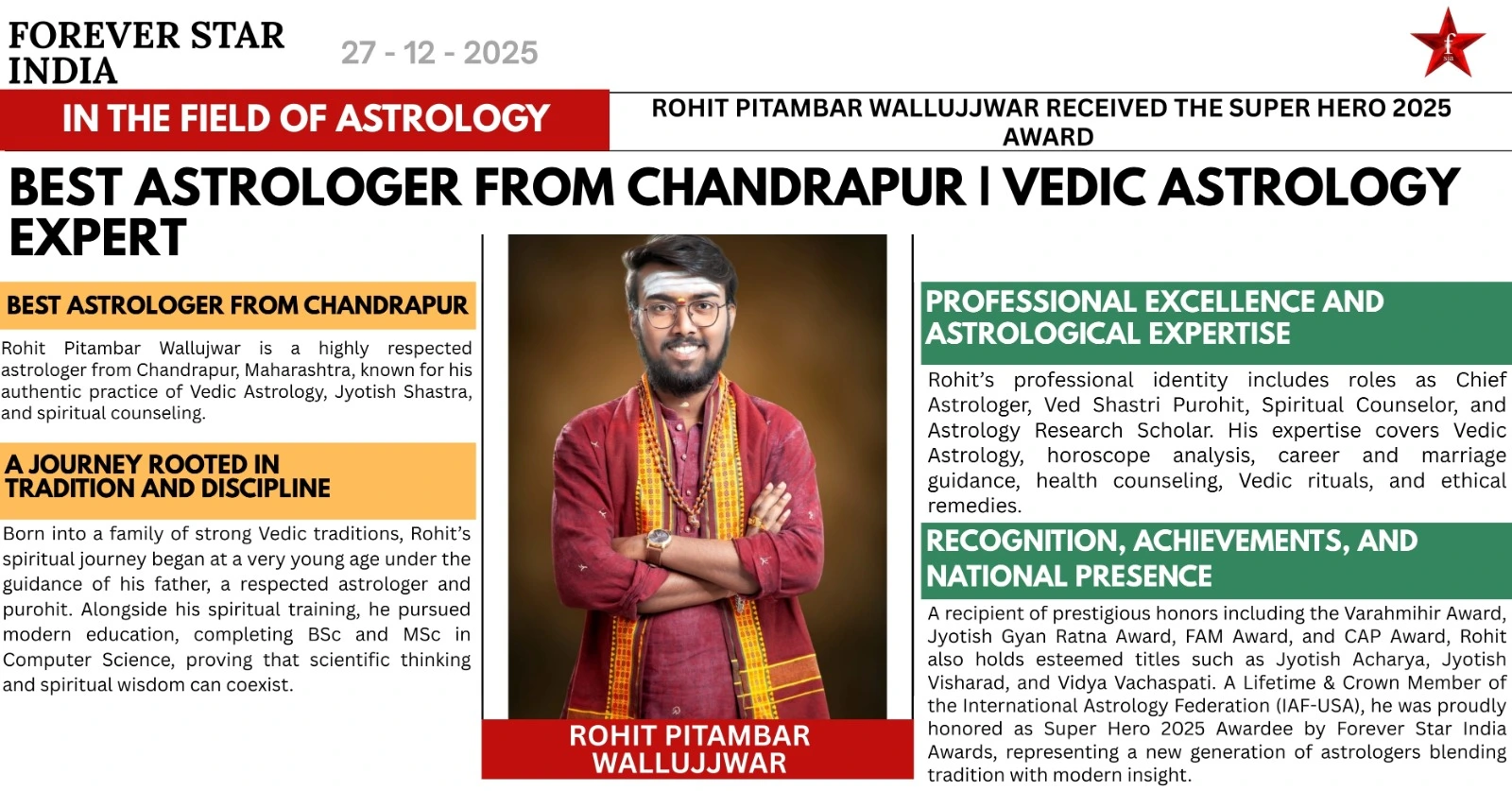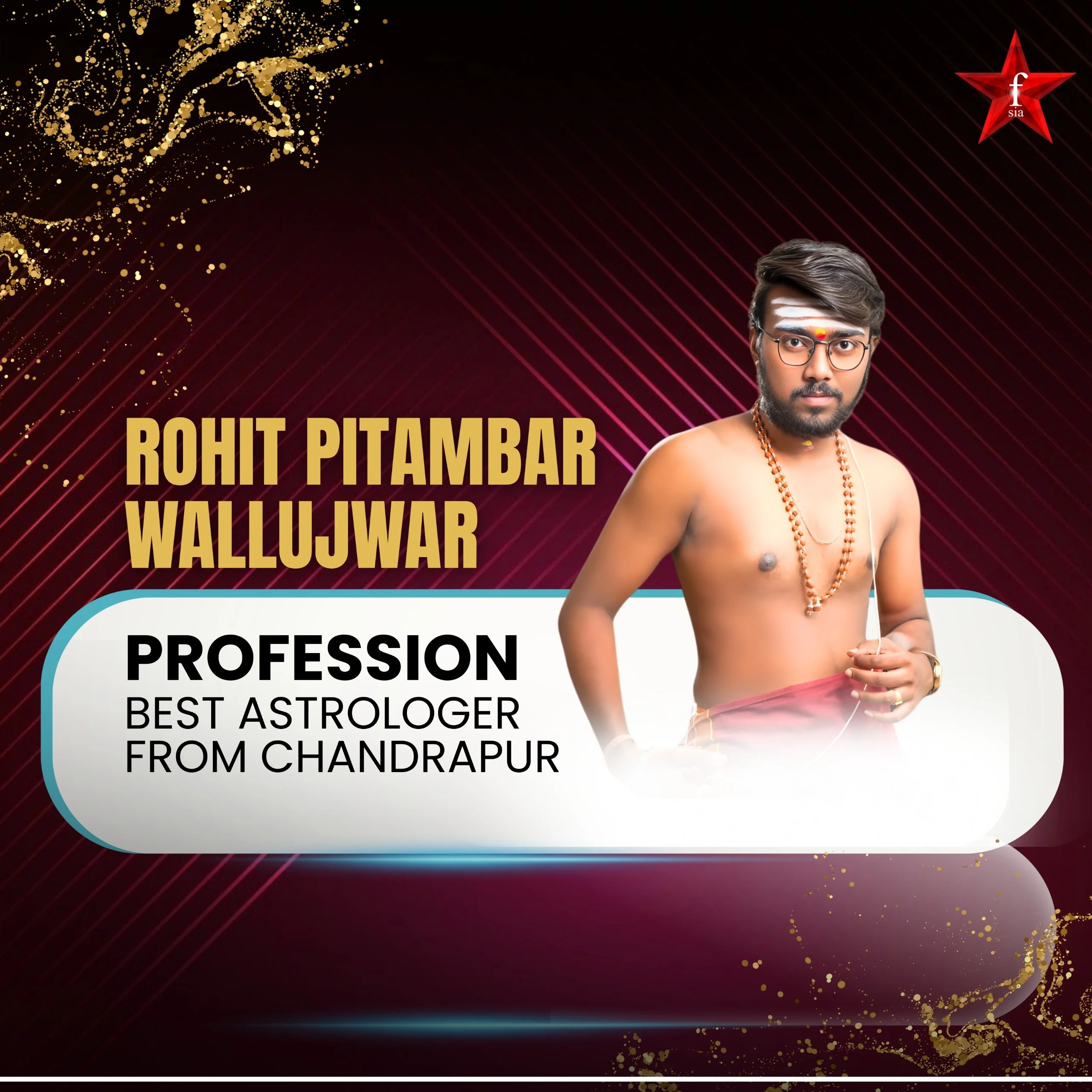 Rohit Pitambar Wallujwar is a highly accomplished Best Astrologer from Chandrapur, Maharashtra, widely recognized for his deep expertise in Vedic astrology, Jyotish Shastra, and spiritual counseling. A PhD Gold Medalist in Astrology and founder of Balaji Jyotish Karyalay, he is known for offering ethical, solution-oriented guidance rooted in ancient Vedic knowledge. Honored as a Super Hero 2025 Awardee by Forever Star India Awards, he stands today as one of the most respected and promising astrologers emerging from Chandrapur.