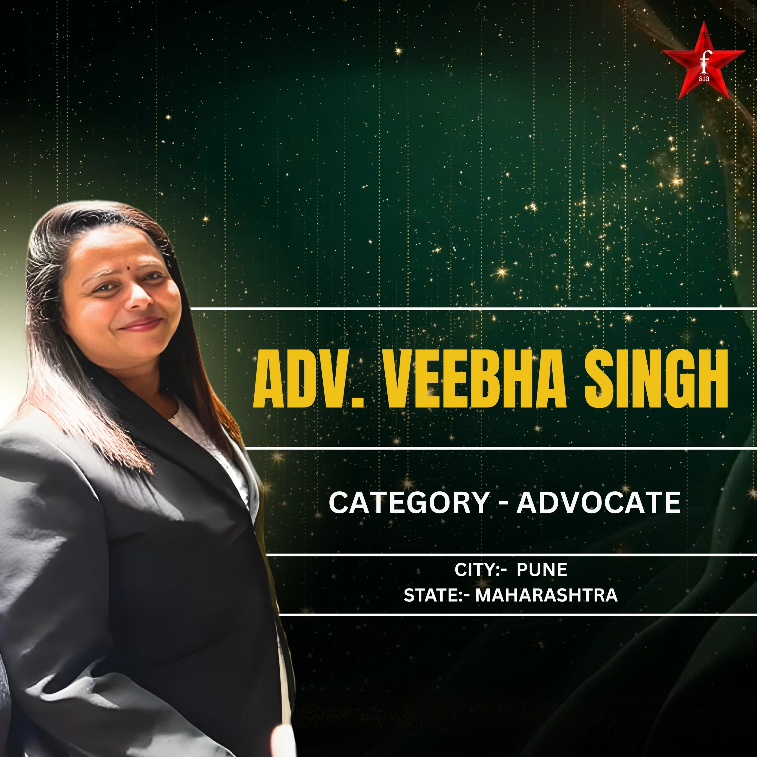 Adv Veebha Singh honored with Best Advocate in Pune, Maharashtra, widely respected for her contributions to law, education, and social empowerment. She is a Well Known Female Legal Professional, Educationalist, and Counsellor, She is known for combining legal expertise with ethical leadership and compassionate guidance. Honored as "Best Legal Advisor in Pune 2025" by Super Woman Award 2025 by Forever Star India, she stands today as one of the most impactful women advocates emerging from Pune.