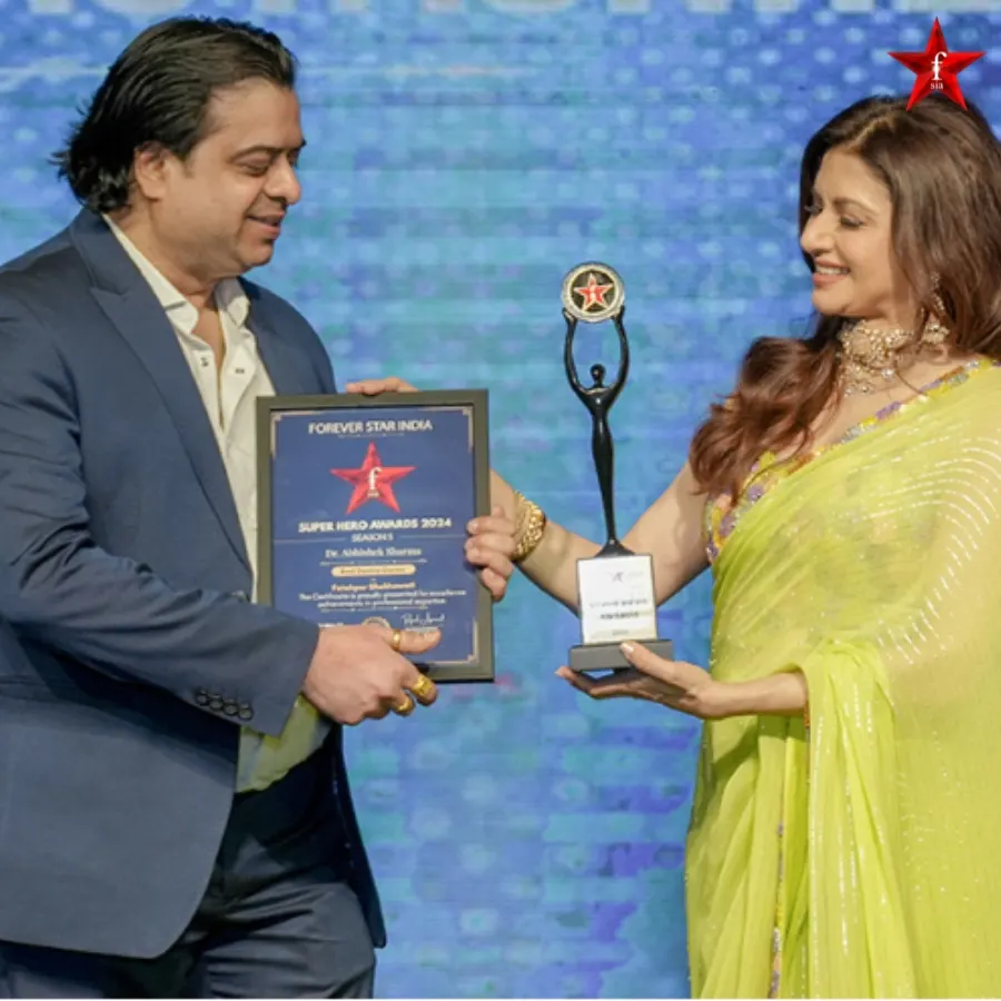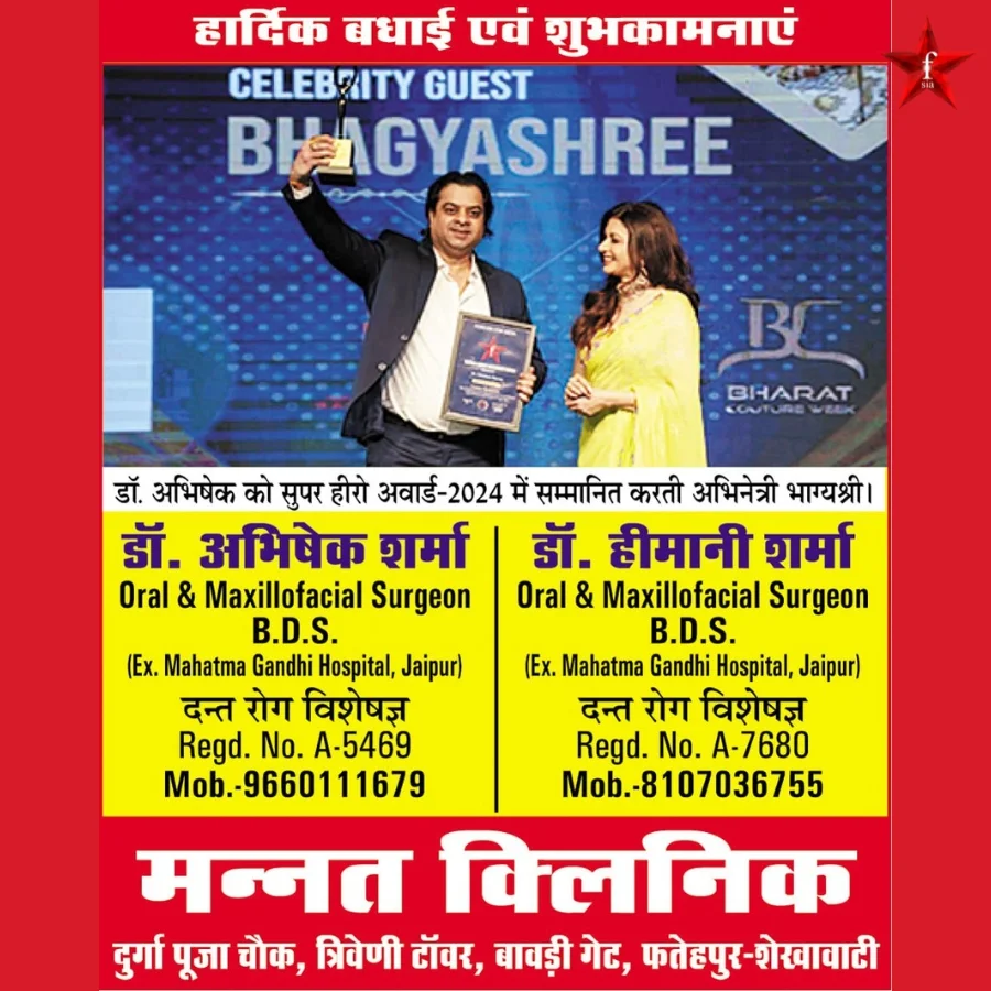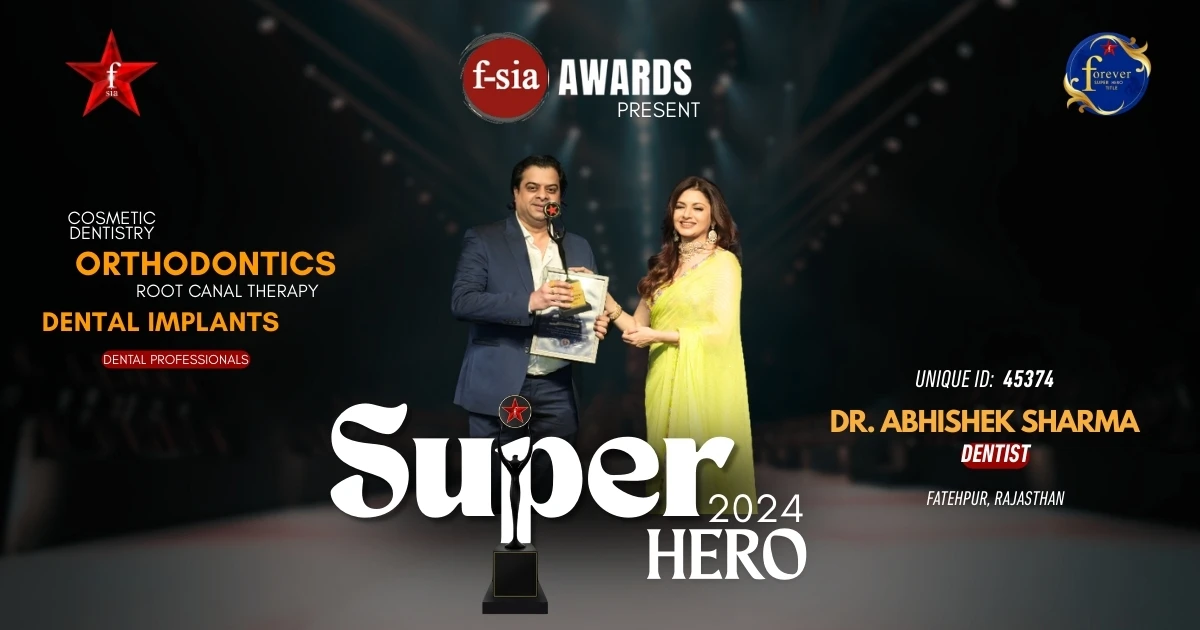 At the prestigious Super Hero Awards 2024, Bollywood actress Bhagyashree personally congratulated Dr. Sharma, who was recognized nationally as the Best Dentist in Fatehpur Shekhawati. His commitment to quality and innovation in dentistry is reflected in this award, which was given by Forever Star India.