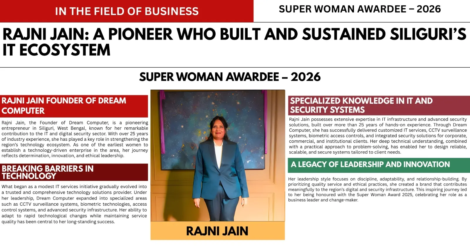 Rajni Jain is a visionary entrepreneur and the founder of Dream Computer, a well-established IT and security solutions company in Siliguri, West Bengal. With more than 25 years of experience, she stands among the earliest women entrepreneurs to enter the region’s technology sector. Recognized today as a leading surveillance expert in Siliguri, her journey of resilience, leadership, and long-term impact earned her the Super Woman Award 2025 for outstanding contribution to business and society.