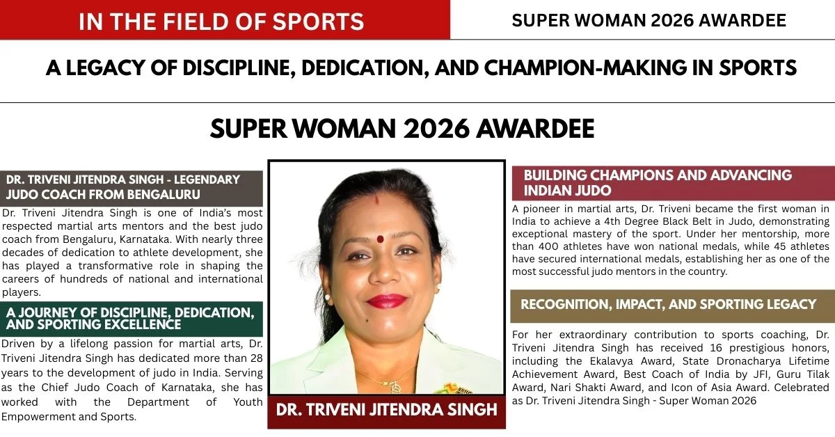 Today, Dr. Triveni Jitendra Singh, the best judo coach from Bengaluru, continues to mentor athletes and promote sports culture across India. Her journey stands as a remarkable example of perseverance, leadership, and dedication to excellence. As a proud Super Woman 2026 awardee and an influential awardee in Judo Coach category from Bengaluru, she remains committed to shaping the next generation of champions and strengthening India’s presence in the global martial arts arena.
