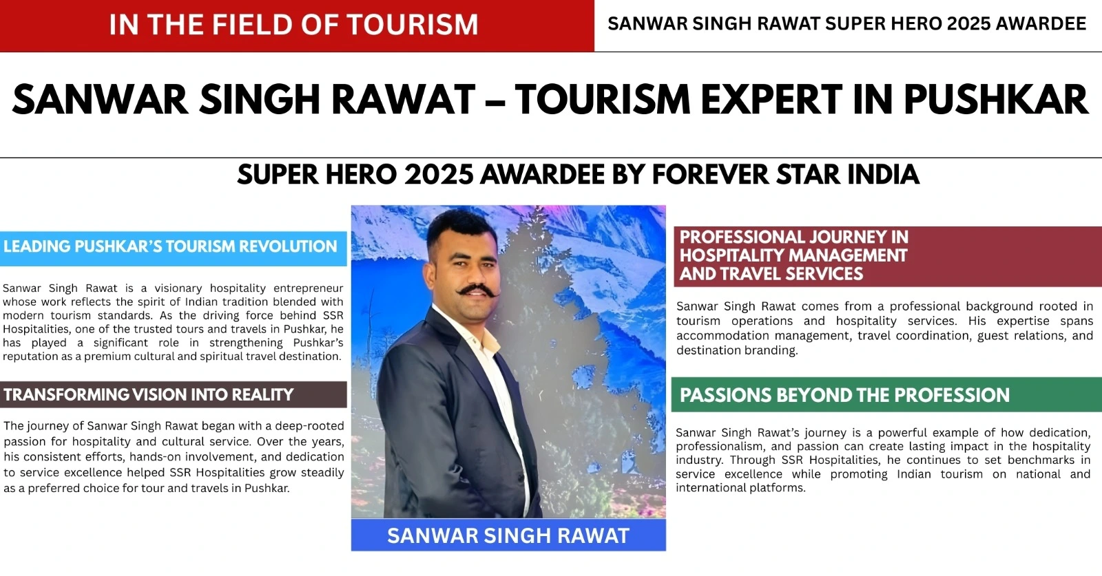 Sanwar Singh Rawat is the Founder and Owner of SSR Hospitalities, a distinguished name among the Best Tour and Travels in Pushkar, Rajasthan. With a strong presence in the Indian tourism and hospitality management ecosystem, he is widely recognized for delivering quality service, cultural hospitality, and destination promotion. His work in tourism operations and travel services has been acknowledged by prestigious platforms including the Bharat Gaurav Samman 2025, Tourism Welfare Association, and leading national and international tourism forums.