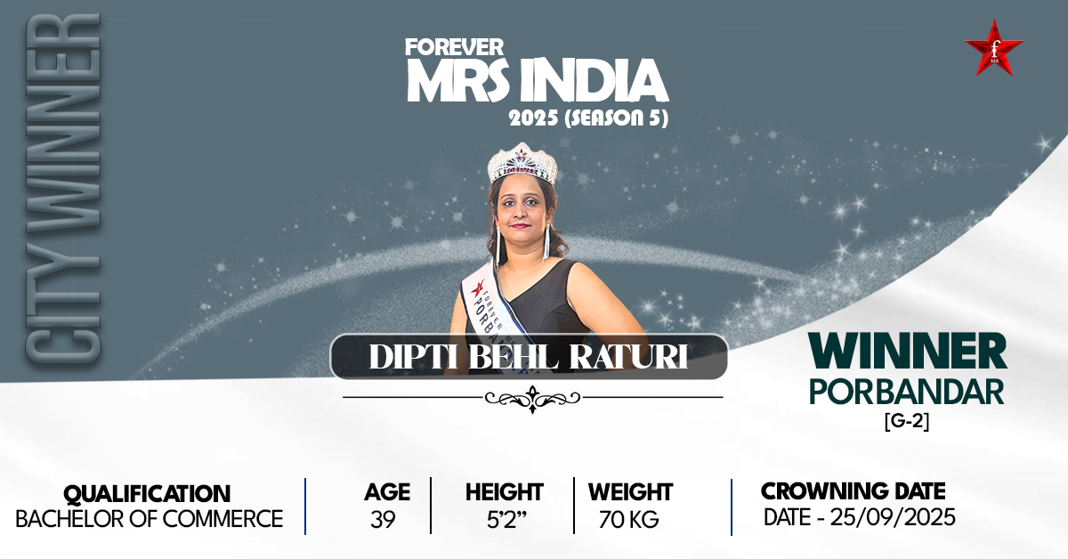 Dipti was well-known as a tomboy, athlete, and all-arounder who flourished in leadership positions from an early age. She was honored as the Best Overall Student and continuously performed exceptionally well while representing her school on a variety of platforms. She was a born leader, always willing to go above and beyond with her passion, self-assurance, and resolve. Her corporate and naval careers, where she broke down barriers and motivated others, were ultimately shaped by this foundation of discipline and resiliency. Her admission into FSIA today ushers in a new era where her lifelong journey of achievement and service combines with her passion for empowerment, glamour, and transformation. In addition to being a significant personal achievement, winning Mrs. Porbandar 2025 serves as a reminder that dreams are ageless.