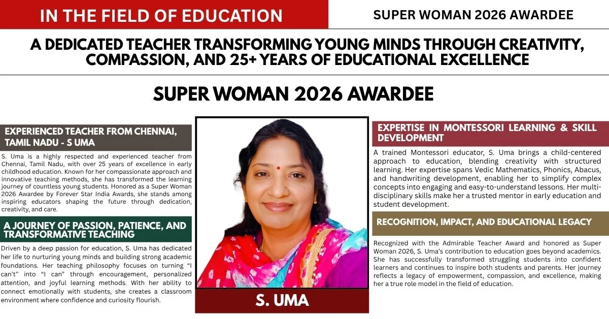 Recognized as a Super Woman 2026, S Uma stands among leading Super Women Achievers who are shaping the future through education. Her journey reflects passion, patience, and purpose. As an experienced teacher in Chennai Tamil Nadu, S Uma continues to inspire young minds, empower students, and contribute meaningfully to society through education.