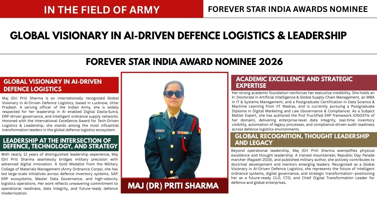 Maj (Dr) Priti Sharma’s journey is defined by discipline, resilience, physical excellence, and strategic foresight. Beginning her leadership path within the Indian Army’s logistics ecosystem, she earned recognition for analytical precision, operational clarity, and performance in high-stakes environments. As technology evolved, she emerged as a Global Visionary in AI-Driven Defence Logistics, possessing the specialised skills, research orientation, and technical acumen to integrate Artificial Intelligence, ERP modernization, and intelligent automation into defence logistics frameworks. Through continuous learning, innovation, and capability development in AI-enabled systems, her journey reflects the convergence of defence-grade discipline and future-ready digital logistics vision.