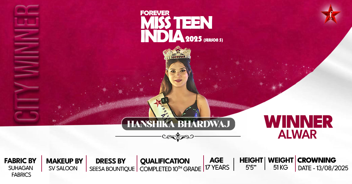 Hanshika Bhardwaj, the 2025 Miss Teen Alwar, is a young woman from Alwar, Rajasthan, who has distinguished herself in modeling and academia. After finishing the tenth grade, she has already built a successful portfolio by winning traditional Indian martial arts, sports competitions, and beauty pageants. Her ability to study while simultaneously participating in a variety of sports, including badminton, cricket, table tennis, gym training, sword fighting, and modeling, further demonstrates her diversity. The greatest testament to her beauty and command on stage has been her victories in contests such as the Mr., Miss, and Mrs. Alwar competition's Best Walk and the Junior Miss India pageant's Miss Prettiest Hair. With poise, confidence, and tenacity, Hanshika hopes to become a well-known model and an ambassador for India abroad. She views her experience not only as her own, but also as a means of encouraging other young girls to dream big and pursue their goals fearlessly.