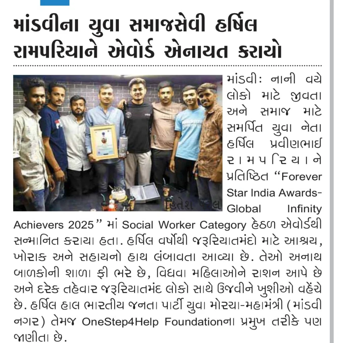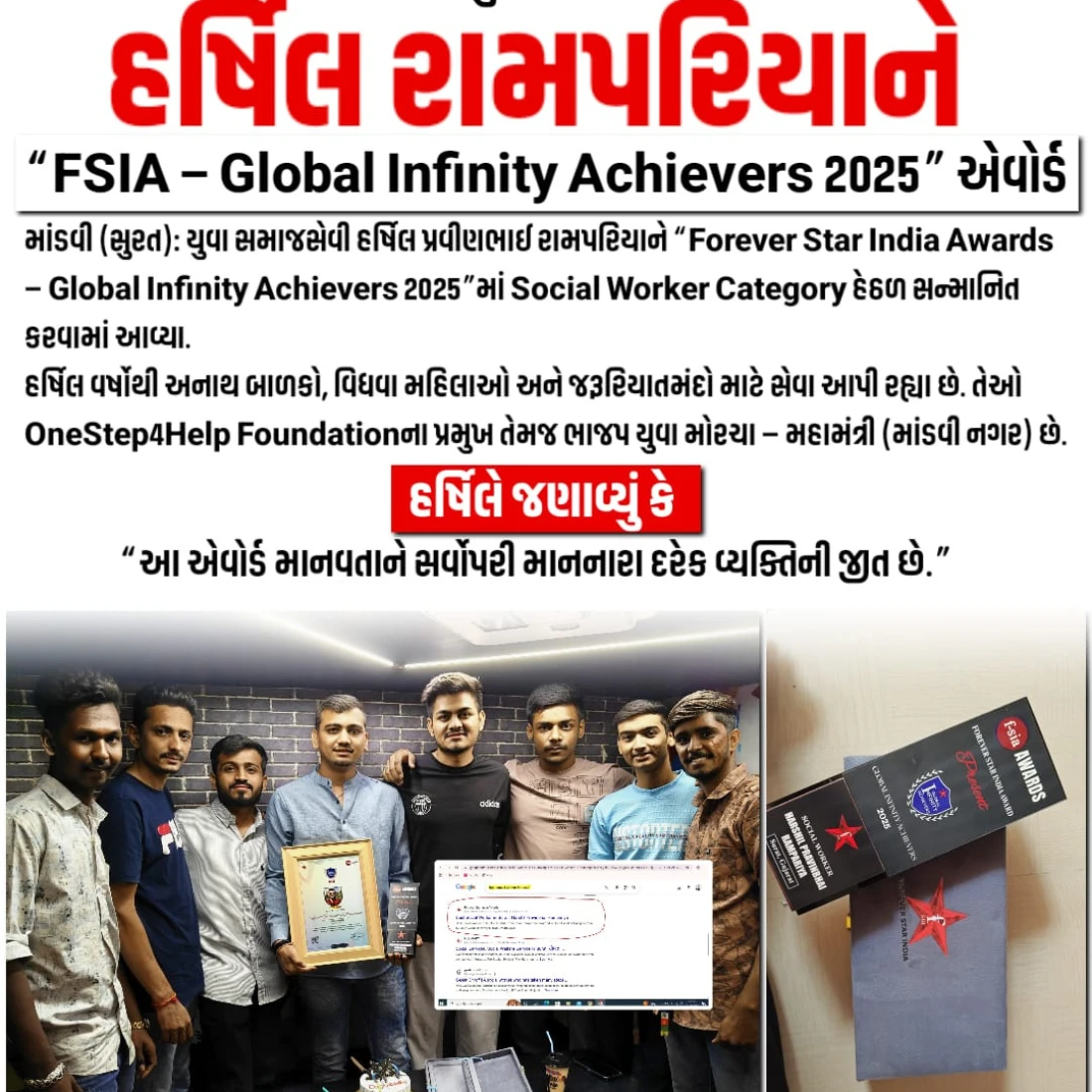 Over the years, Harshil balanced education, social service, and leadership responsibilities with determination and discipline. His consistent efforts and dedication earned him recognition as an Infinity Achiever from the Forever Star India Awards, marking a major milestone in his journey of empowering youth and improving community welfare. For Harshil, true success lies in the positive impact he creates in the lives of others and the hope he instills in society.