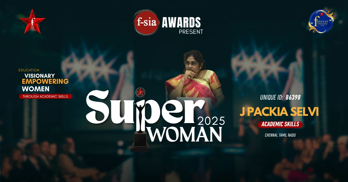 J Packia Selvi has now been crowed the title of Super Woman 2025 Holder, Chennai, in the Academic Skills category. A first-grade structural engineer, Packiaselvi is also an entrepreneur, philanthropist, and an advocate for women's empowerment. Her journey from humble beginnings to founder of Jeny Home Planners and Builders and various social initiatives speaks of her resilience, grit, and undeterred commitment to the upliftment of the society.
