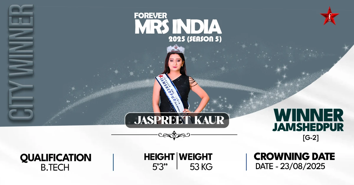 Though she had a very demanding career, Jaspreet remained attached to her art roots. Her 6-year training in Kathak helped her master discipline, elegance, and emotional richness that made her a performer and a professional. Marriage gave her a more meaningful dimension to her journey and helped her get encouragement and the strength to dream bigger. Forever Mrs. India 2025 became a life-altering event, a self-discovery, expression, and empowerment platform. Taking the Jamshedpur title is not only a personal victory but also a lesson to all women for what they can accomplish in their careers, and to be proud it.