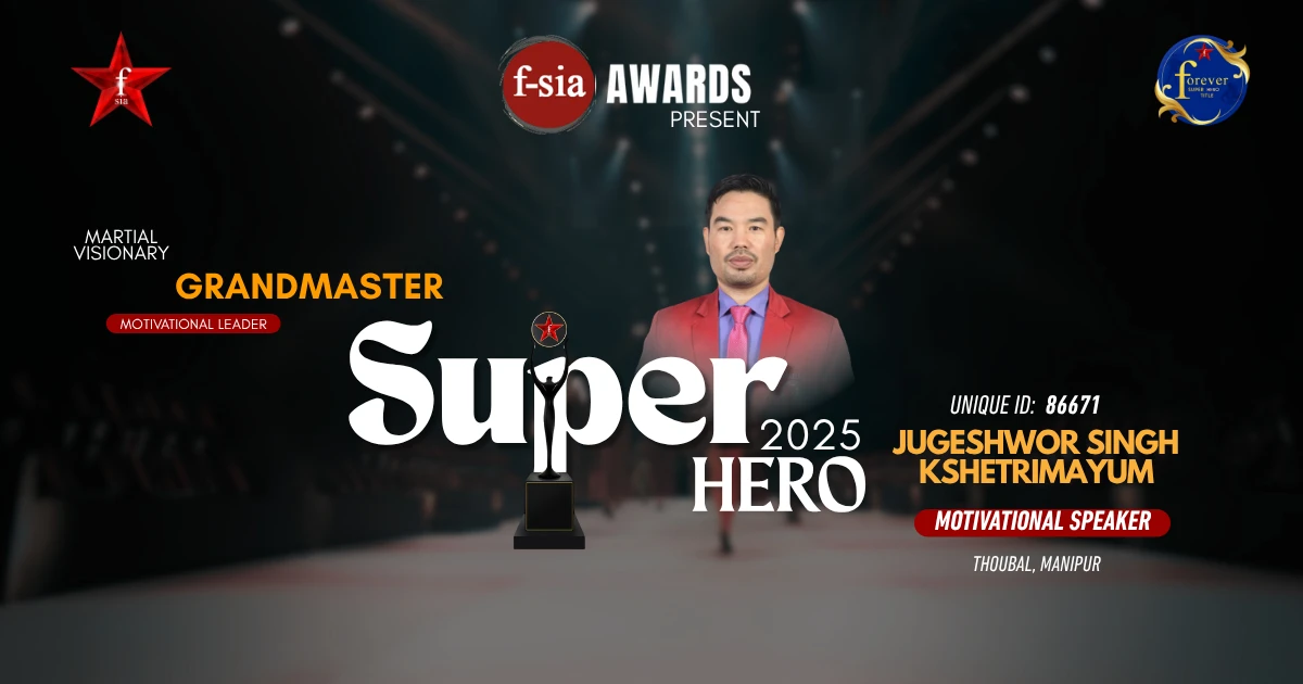 The Title Holder in Super Hero 2025 in the Motivation Speaker is Jugeshwor Singh Kshetrimayum from Thoubal. He is an Executive Committee Member of the World Kuo Shu Federation based in the USA and Chairman of India Kuo Shu Federation. He is the founder and head of the Warrior Kung-Fu Academy, Bangalore, and International Academy for Learning Martial Arts, Manipur, to bring global attention to martial arts education.