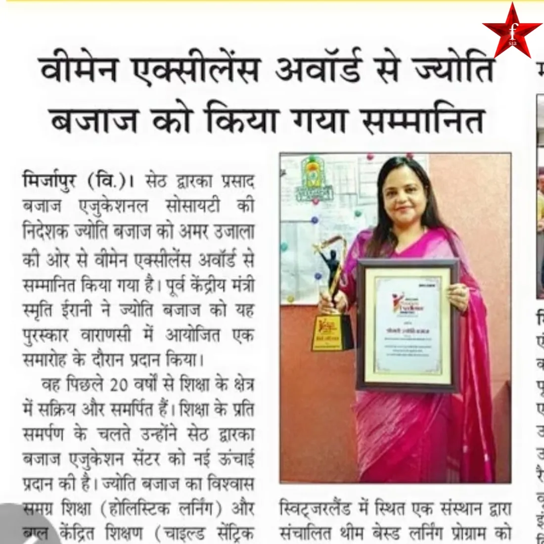 Mrs. Jyoti Bajaj, a pioneering Educationalist from Mirzapur, has dedicated over two decades to nurturing young minds through innovative and value-based education. As the Director of Seth Dwarka Prasad Bajaj Educational Society, she has championed holistic learning practices that integrate creativity, emotional intelligence, and cultural awareness. In 2025, Mrs. Bajaj received the Amar Ujala Women Excellence Award from former Union Minister Smriti Irani, recognizing her exceptional service to education. Her approach blends aesthetics with pedagogy drawing from her background as an interior designer and her advanced training in theme-based learning from Switzerland. This unique combination allows her to design learning spaces that stimulate curiosity, creativity, and a love for nature and family values.