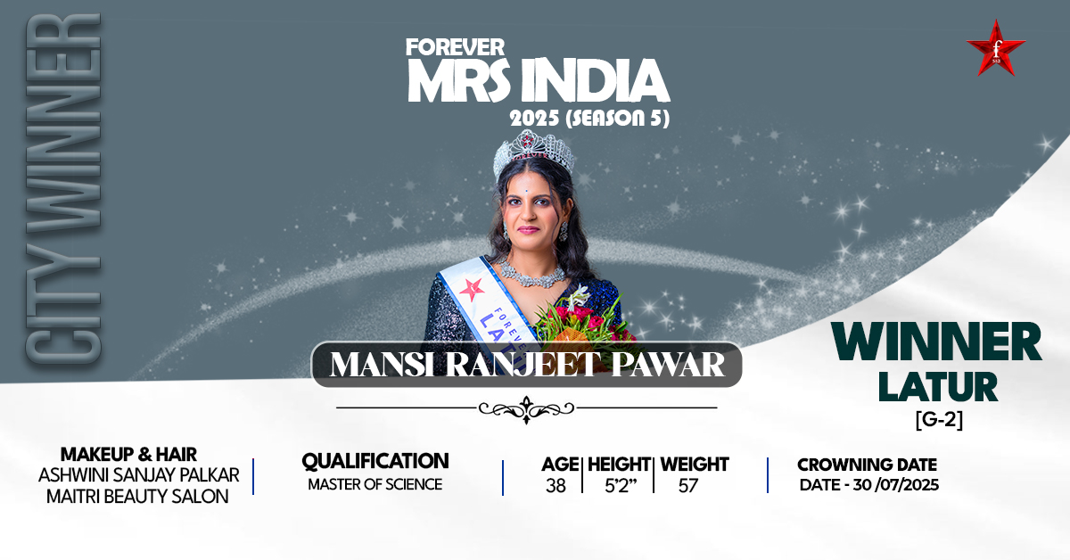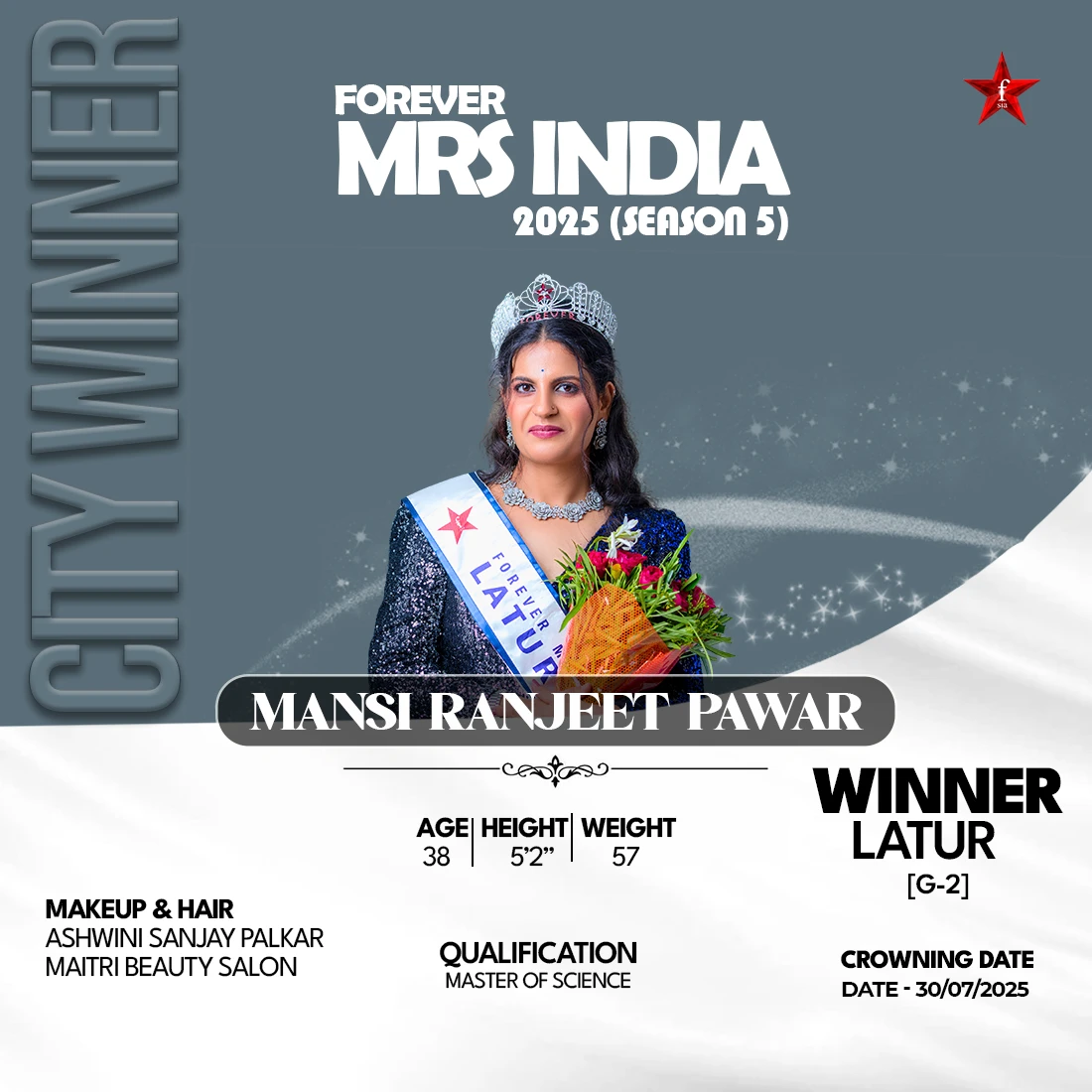 Since childhood, Mansi has fantasized about being on a great stage, wearing a crown to signify her success. As a child growing up in Latur, she developed a passion for learning and an inexplicable curiosity towards the world that eventually shaped her direction towards obtaining a Master's in Bioinformatics. This academic experience was not only academically based, but it also instilled in me the discipline, resilience, and purpose-driven mindset. When she became a teacher, Mansi found fulfillment in shaping young minds and opening them up to the possibilities of knowledge and creativity. Her victory as Mrs Latur 2025 marked a turning point in her life, as she stepped out of her familiar world and entered a realm of glamour, confidence, and self-identity. Mansi considered it not only as a challenge to herself but also as an official trial to represent her city, her profession, and the values that she holds. Her achievement in winning the crown is evidence of her commitment, hard work, and continuous support from her loved ones. It also confirms her suspicion that women can play well in various roles, at the same time remaining loyal to their interests and values. She is now continuing her mission to inspire and make positive change on a bigger platform.
