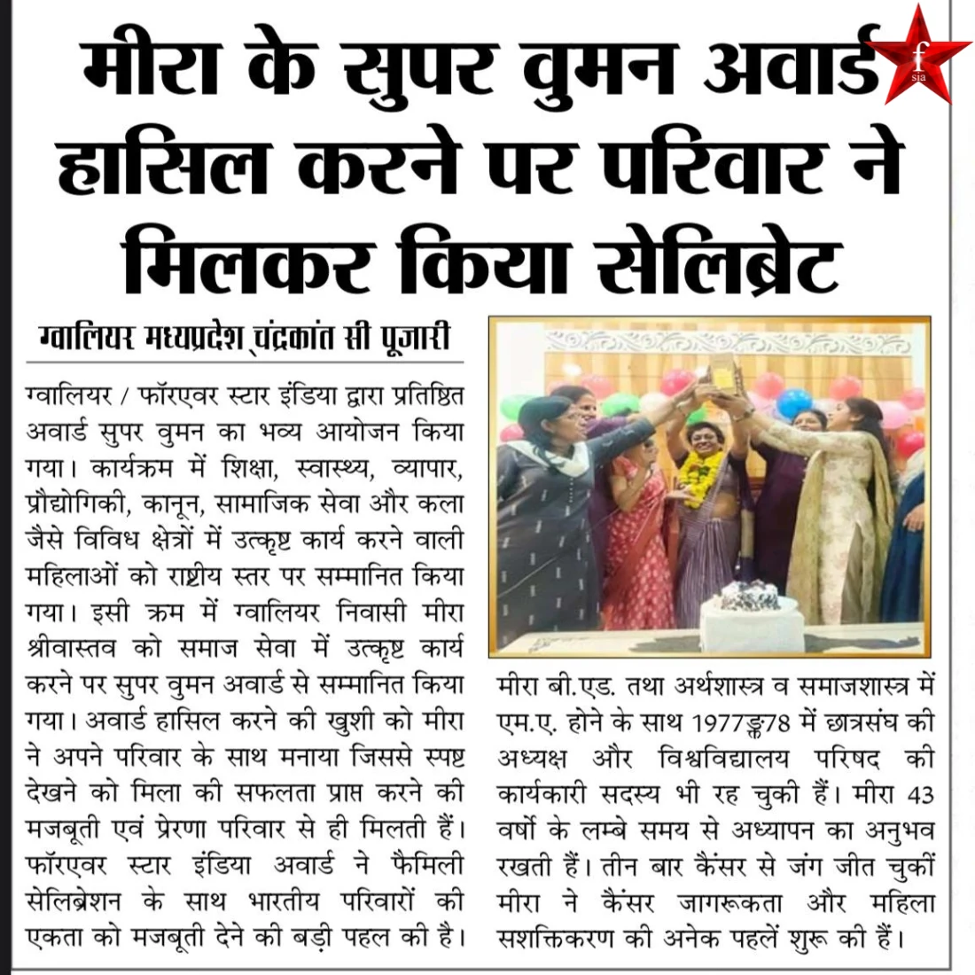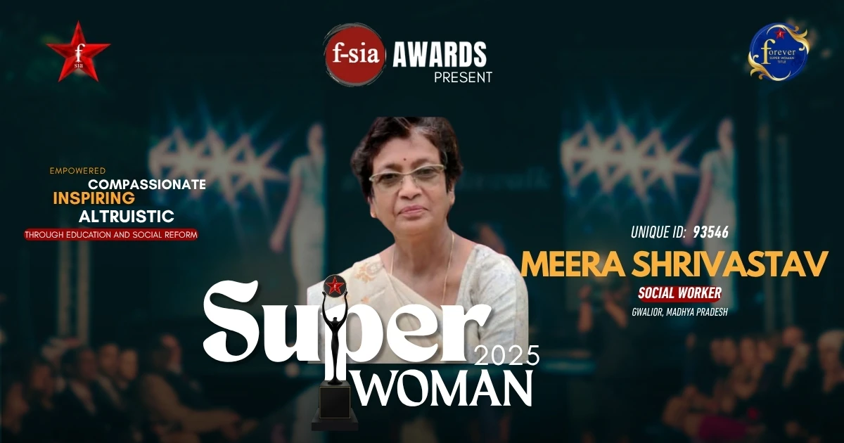 Mrs. Meera Shrivastav from Gwalior, Madhya Pradesh, has been honored as a Super Woman 2025 by the Forever Star India Awards in the Social Worker category for her remarkable dedication to education and social reform. With over 43 years of experience as a Principal, Director, and Administrator, she has devoted her life to nurturing students and empowering women through value-based education. A three-time cancer survivor, Mrs. Shrivastav turned her personal struggles into a mission of service. Her resilience inspired her to spread awareness about cancer prevention and women’s health, collaborating with the Cancer Hospital and Research Institute, Gwalior, to conduct awareness sessions across schools and colleges. An author, counselor, and social reformer, she continues to motivate people through her writings and campaigns on women empowerment, senior citizen welfare, and life skill education. Despite enduring immense physical challenges, she stands as a living example of courage, compassion, and purpose truly embodying the essence of a Super Woman 2025 who transforms pain into power and service into legacy.