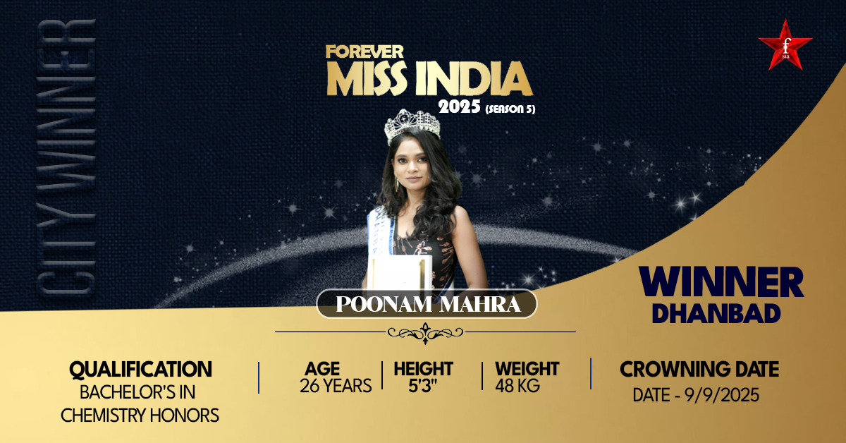 Poonam Mahra, a remarkable young lady from Dhanbad, Jharkhand, was crowned Miss Dhanbad 2025. She is a certified NLP practitioner and a Chemistry (Honors) graduate who has used her personal challenges as a springboard to motivate others. She embodies the virtues of perseverance, development, and resolve because she has experienced adversity since childhood. Her journey embodies the spirit of a changemaker someone who wants to inspire young girls to follow their dreams without fear and bring about positive social change, particularly in underprivileged communities.