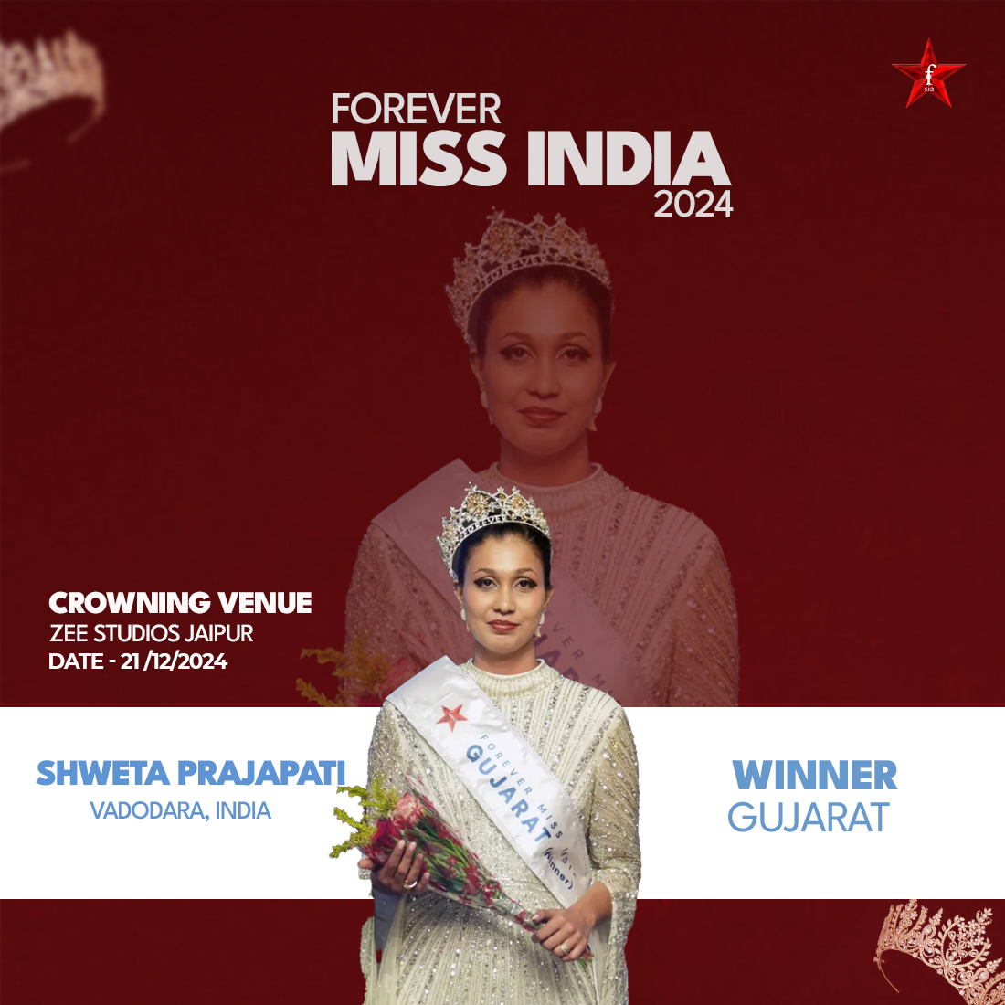 At the Forever Miss India Grand Finale, Shweta Prajapati was crowned Miss India 2024 Gujarat. She is a proud representative of Gujarat and is well-known for her poise, self-love, and confidence.