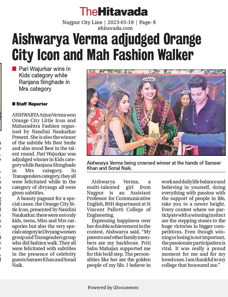 Journey: Her triumph as Miss Nagpur 2024, which acknowledged her poise, self-assurance, and capacity for motivation, marked the beginning of Aishwarya's path to Miss Maharashtra 2024 (2nd Runner Up). It took discipline, training, and a great deal of self-belief to prepare for the state-level competition.Aishwarya demonstrated her intelligence, clear communication, and strong commitment to social change throughout the competition, in addition to her beauty. She demonstrated her tenacity and resolve by juggling her rigorous teaching career with pageant preparation.She ultimately won the title of 2nd Runner-Up at the City Finale thanks to her powerful personal narrative and on-stage performance, which was a significant turning point in her quest to uplift women.