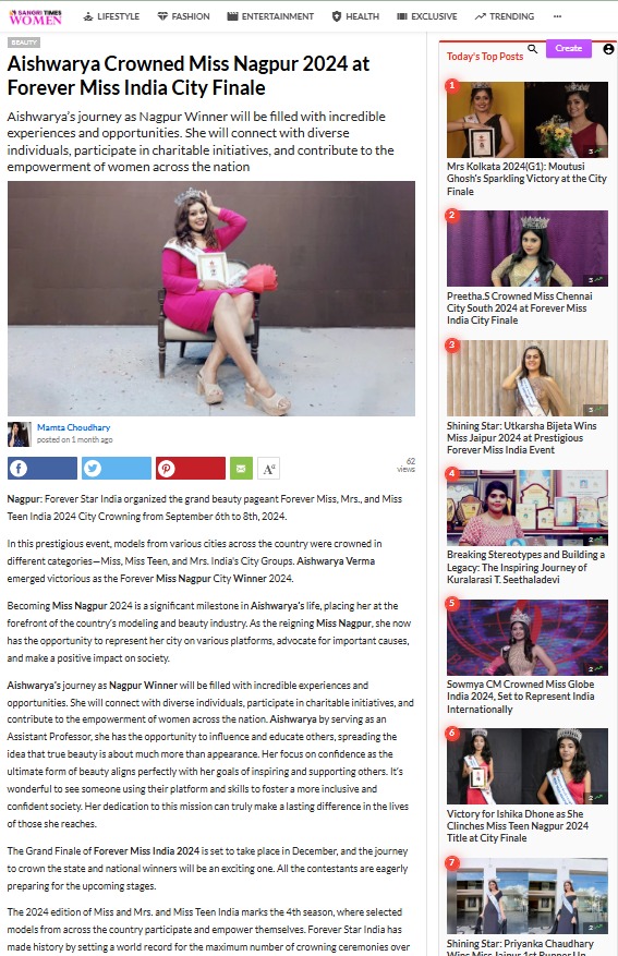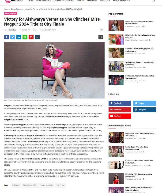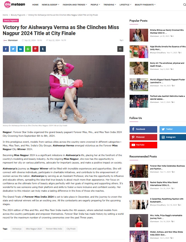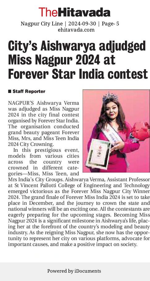Aishwarya Verma, a 25-year-old educationist from Nagpur, Maharashtra, skillfully combines the realms of pageantry and academia. She recently won the title of Miss Maharashtra 2024 (2nd Runner Up) at the Forever Miss India 2024 City Finale, and she embodies the ideal fusion of intelligence, style, and purpose. Aishwarya, who is from the vibrant city of Nagpur, has always placed a high importance on empowerment, education, and self-improvement. She is dedicated to forming young minds as a professor, using her expertise to support the upcoming generation. Her foray into the world of beauty pageants was not solely about glitz; it was also about leveraging the stage to advocate for women's empowerment and self-assurance.Her journey from Nagpur to the pageant stage is evidence of her conviction that women can be elegant, strong, and intelligent at the same time. The goal of Aishwarya is very clear: to enable young women to break down barriers, value their uniqueness, and boldly pursue their dreams.