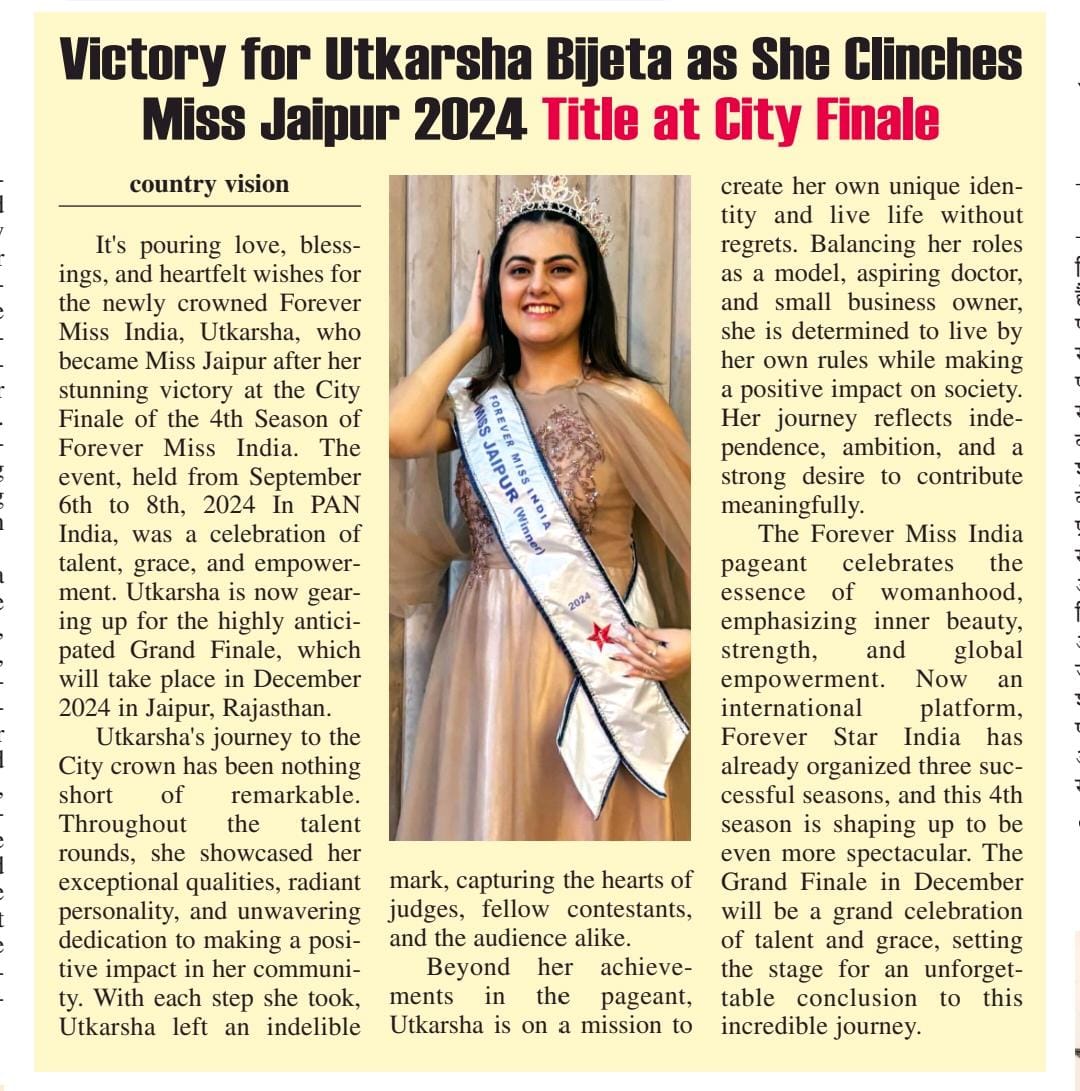 Journey: Utkarsha's ascent to the title of Forever Miss India Rajasthan 2024 is evidence of her tenacity and fortitude.She started modeling out of pure enthusiasm, practicing her stage presence and taking part in local events.She demonstrated her talent, grace, and intelligence when she won Miss Jaipur 2024 as a result of her hard work and dedication.Her popularity in pageantry strengthened her position as a role model for young women by providing her with a larger platform to discuss healthcare, education, and mental health. She demonstrated that one can succeed in both academics and personal passions with perseverance by juggling the demanding requirements of medical school.