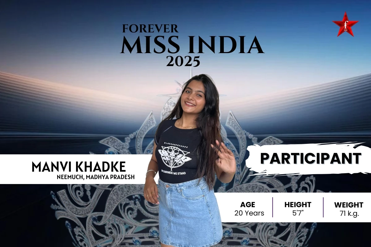 Manvi Khadke, a 20-year-old from Neemuch, Madhya Pradesh, is a Forever Miss India 2025 official contestant. She is eager to establish herself in the modeling and pageantry industries and is passionate about fitness, fashion, and personal development. Through her journey, Manvi hopes to inspire others with her self-assurance, self-control, and innate passion for the camera. She now resolutely pursues her late mother's dream, embodying not only her own vision and blessings but also her mother's vision.