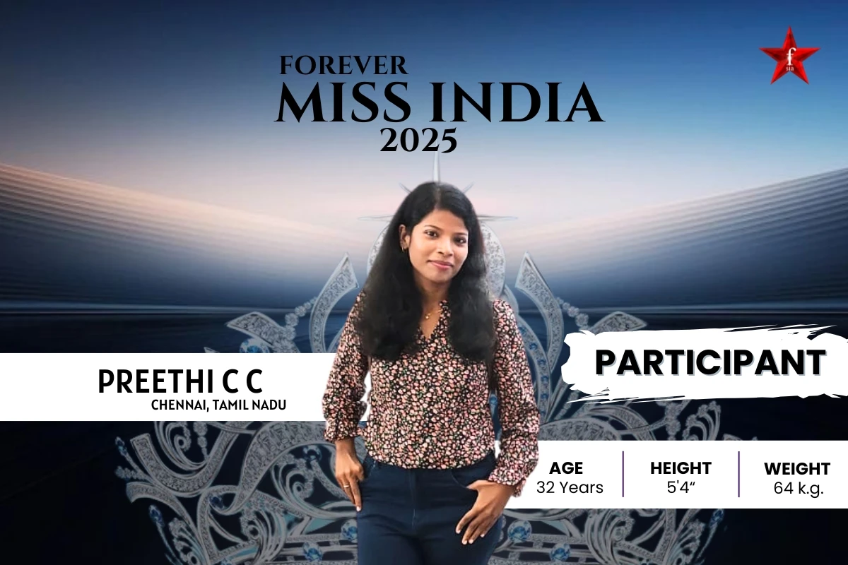 Preethi C C, representing Tamil Nadu,Currently employed in the Commercial Department of NLC India Limited, She is a young professional from Tamil Nadu, oversees regulatory and policy issues influencing the country's energy industry. Alongside her work, she has a strong interest in fitness and personal development. She dedicates herself to strength training, 10,000 steps a day, and a disciplined lifestyle that embodies her values of perseverance and consistency. According to Preethi, genuine beauty lies in self-assurance, empathy, and willpower rather than outward appearances. She hopes to elegantly celebrate individuality, grace, and ambition as a competitor in Forever Miss India 2025. In addition to her professional accomplishments, her journey demonstrates her desire to encourage others to live authentically and dream big.
