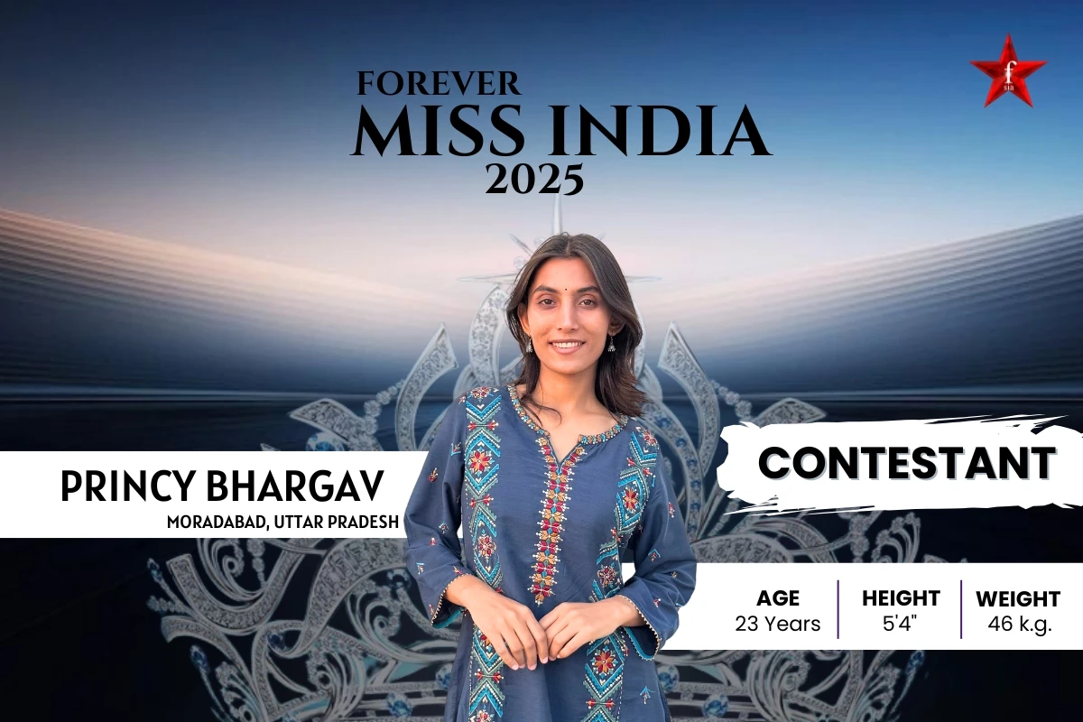 Princy Bhargav, representing Moradabad, Uttar Pradesh, is an inspiring Miss India 2025 contestant with a heart full of dreams and determination. She is a University of Delhi English (Hons) graduate currently working as a fashion model in Moradabad and studying for the UPSC CSE. Princy, who is well-known for her bravery, uniqueness, and grace, strikes a balance between intelligence and artistic ability through her passion for reading, painting, modeling, and ceramics. As a young model from Moradabad, she wants to show that beauty and ambition can coexist with purpose by encouraging women to believe in themselves and follow their dreams without fear.