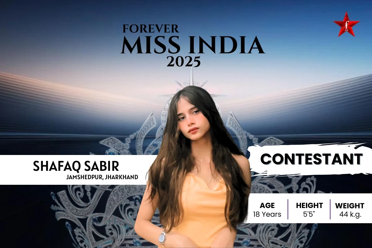 An official contestant for Forever Miss India 2025 is 18-year-old Shafaq Sabir from Jamshedpur. She just finished her 12th grade and is now pursuing a BBA while pursuing her genuine passions for modeling and fashion. She has always had a strong interest in fashion and makeup and feels that creativity is the best way to express one's uniqueness. Shafaq, who is 5'5", is committed to learning, developing, and seizing every chance that presents itself on this fascinating adventure.