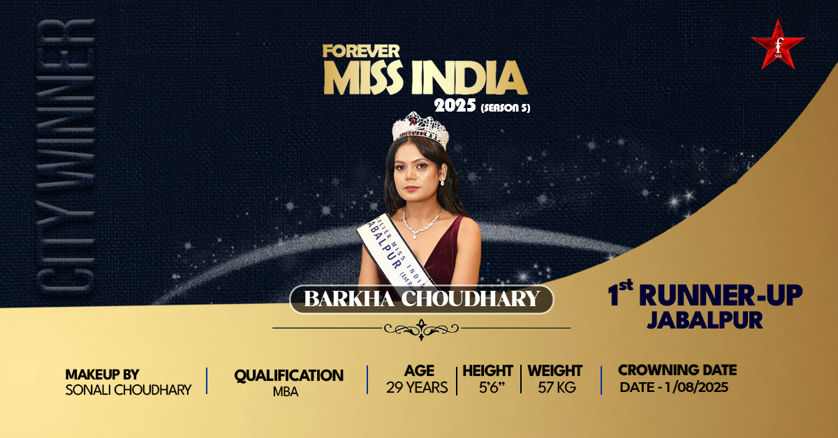 Miss Jabalpur 2025 (1st Runner-Up) Barkha Choudhary is the bright, ambitious, and driven woman of Jabalpur, Madhya Pradesh, who embodies intelligence, creativity, and perseverance with pride. As a Sociology graduate with a special interest in management studies, Barkha has successfully combined academic life with sports feats at the national level and in artistic fronts. She is pursuing her MBA at Gyan Ganga College and is busy preparing for competitive government exams, which reflects her focus and vision for a multidimensional life. She has been conscientious, convinced, and also persevering in her voyage into the Forever Star India Awards. By encouraging women to discover their potential and make a difference, Barkha believes that FSIA has given her a voice and made them vocal within the community to spread awareness about women's empowerment. The combination of her calmer tendencies and upbeat spirit enables her to participate usefully in relationships with people and opportunities. Being the 1st Runner-Up representative of Jabalpur, she wears her city with pride and hopes to establish a legacy filled with knowledge, strength, as well as compassion.