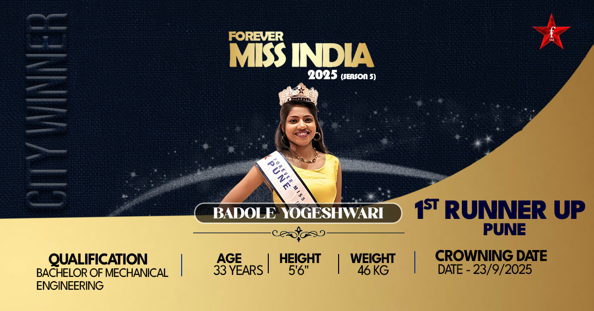 Badole Yogeshwari, crowned Miss Pune 2025 (1st Runner-Up) at the Forever Star India, She is a remarkable individual who skillfully combines creativity, discipline, and intelligence. She was a mechanical engineer before she left the technical field to pursue modeling and acting because she was passionate about transformation and self-expression. In addition to being an avid cyclist, yoga practitioner, and children's yoga instructor, Yogeshwari feels that inner balance, strength, and health are the true definitions of beauty. It is never too late to pursue one's dreams, as demonstrated by her journey of daring reinvention.