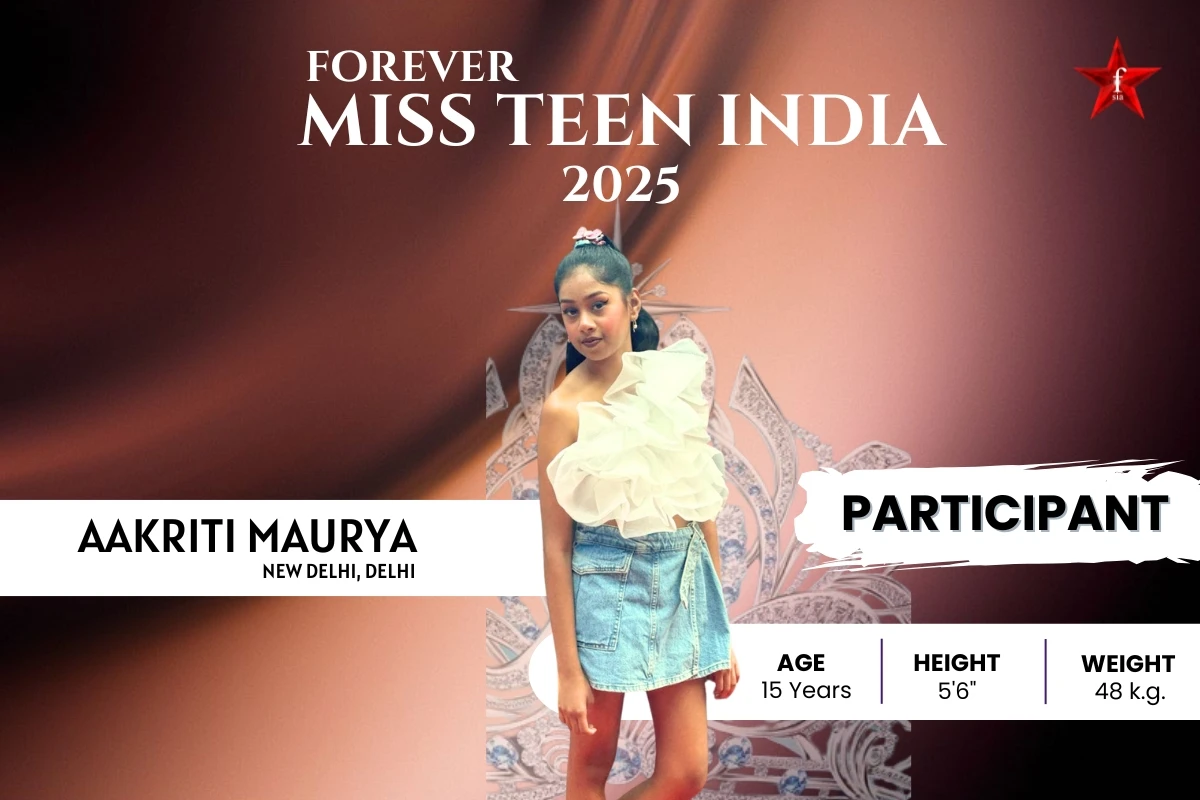 At the age of 15, Aakriti Maurya is a rising star who will compete in Miss Teen India 2025 on behalf of New Delhi. She is presently enrolled in The Modern School ECNCR, Sonipat, Haryana, in Class 10. Aakriti entered the world of pageantry and the modeling industry at an early age because of her lifelong passion for modeling, acting, fashion, and creativity.
