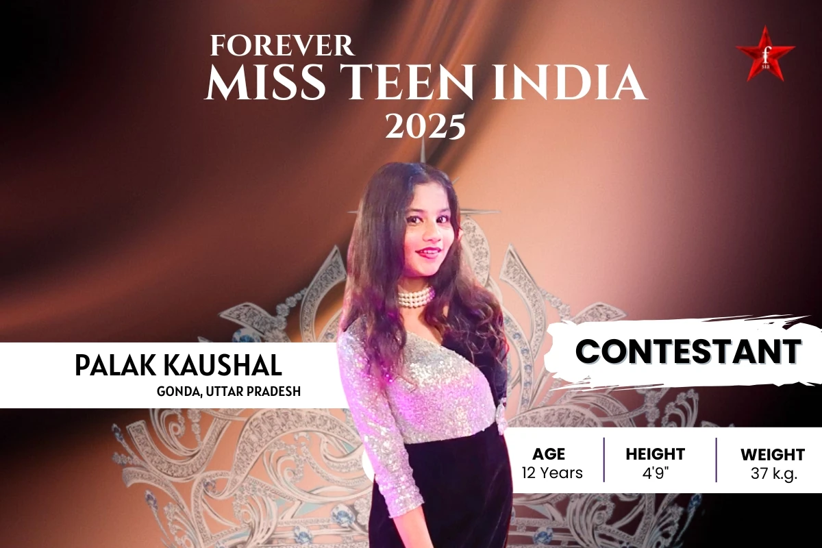 A 12-year-old gifted girl from Maskanwa, Gonda (Lucknow), Palak Kaushal, is representing Gonda with pride as an official contestant in Forever Miss Teen India 2025. She studies in class 7 and aspires to be a star in the entertainment industry. She is an enthusiastic dancer and aspiring actor. With the help of her parents, Mr. Rohit Kaushal and Mrs. Pooja Kaushal, Palak is steadfast in her pursuit of her passion. She is a young, attractive model from Gonda who is inspiring many with her charm and self-assurance.