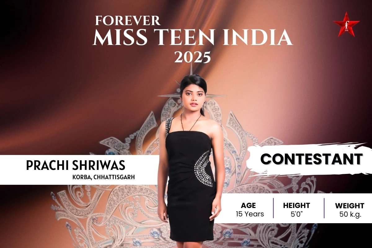 Prachi Shriwas is an official contestant for Forever Miss Teen India 2025, representing Korba, Chhattisgarh. A driven student from Korba who aspires to be a fashion model, she hopes to establish herself in the entertainment and modeling industries. Prachi finds inspiration in her family's fortitude and commitment, as her mother stays at home and her father is in the Indian Army. She is currently getting ready for K-pop and wants to be a young, attractive, and self-assured Korba model.