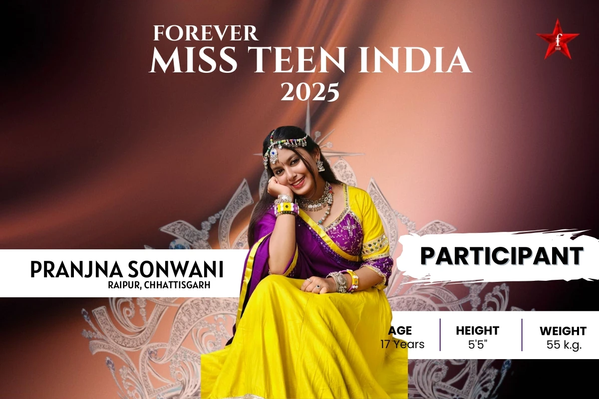Raipur, Chhattisgarh native Pranjna Sonwani is a confirmed contestant for Forever Miss Teen India 2025. She has a great love for modeling and wants to be the wealthiest woman in her family while leading a self-assured and independent life. Outside of the runway, Pranjna enjoys cooking and dancing because they allow her to express her creativity and happiness. Her goal is to encourage other young women to embrace self-assurance, independence, and the bravery to control their own lives because she is a strong advocate for women's empowerment.