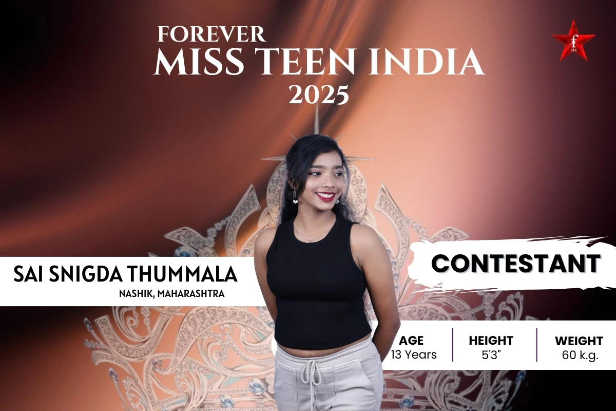 Meet Sai Snigda Thummala, a young, dynamic talent from Nashik who is a contestant for Miss Teen India 2025. She exudes grace, confidence, and resolve. Sai Snigda is already establishing herself in the modeling and fashion industries at the young age of 13. She is an inspiration to young girls who have big dreams and believe in themselves, representing Nashik at the esteemed Forever Miss Teen India 2025 platform.