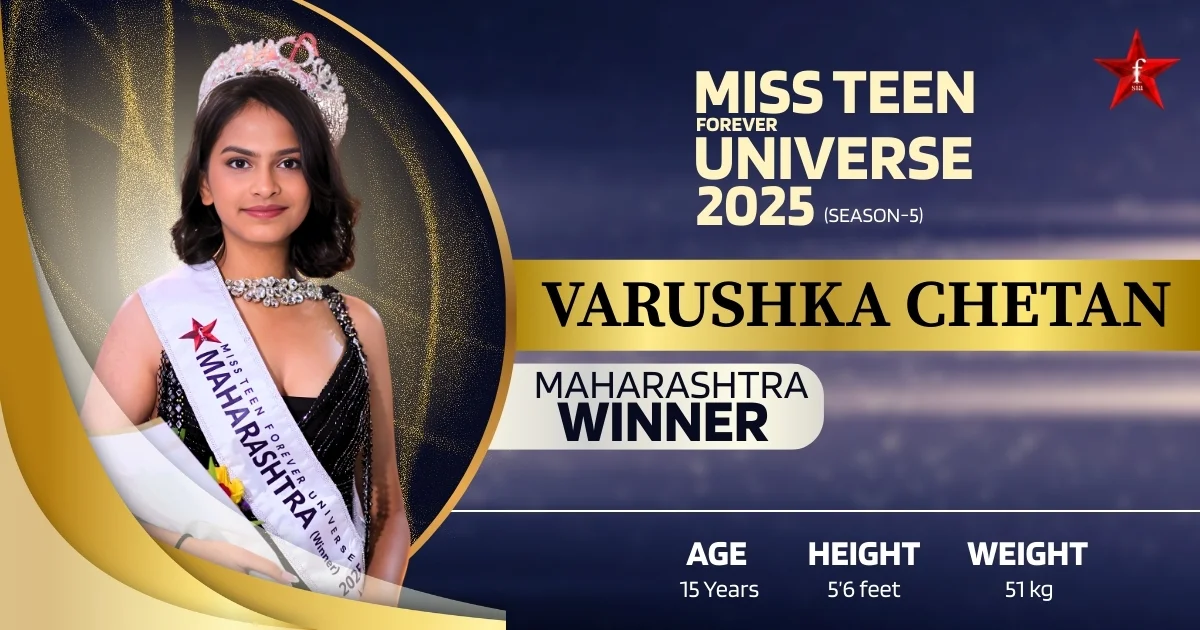 Varushka Chetan Rajgadkar, crowned Miss Teen Forever Universe Maharashtra 2025, is a bright and talented teenager from Mumbai, Maharashtra, who proudly represents the new generation of confident Indian youth. Recognized as the winner of Miss Teen Forever Universe Maharashtra 2025, Varushka has emerged as a celebrated Miss Teen Maharashtra winner and a rising pageant winner in Maharashtra. At just 15 years old, she balances academics with creativity, showcasing her versatility as a model in the Miss Teen category, aspiring fashion model in Maharashtra, and expressive young artist. Her journey reflects passion, discipline, and self-belief, making Varushka Chetan Rajgadkar Miss Teen Universe Maharashtra 2025 winner a name that inspires young dreamers across the state.