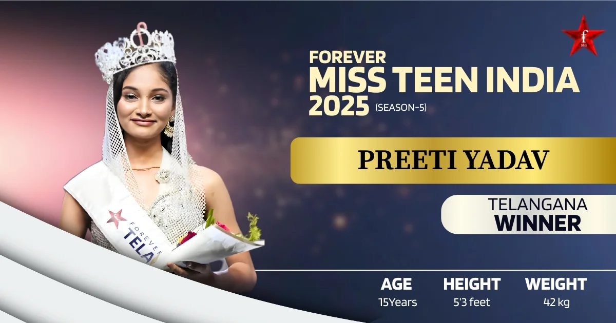 From a young age, Preeti was inspired by her mother’s dream of seeing her achieve greatness. With consistent support from her family, she nurtured her passion for dance and performance. Her dedication, discipline, and courage led her to step into pageantry, where she proudly earned the title of Miss Teen Telangana 2025, marking the beginning of her journey toward larger aspirations.