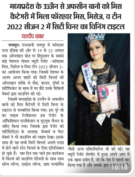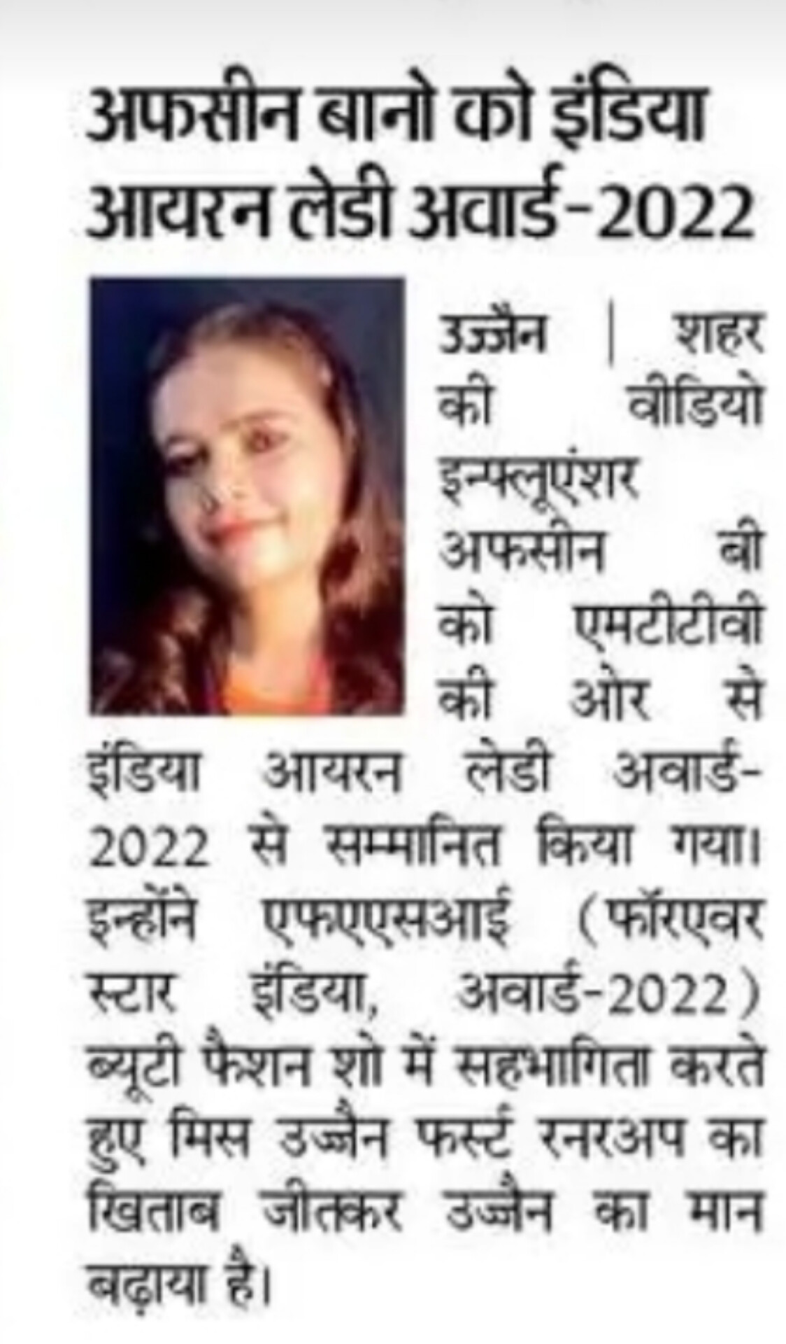 Afsin Bano winner of Miss Ujjain 2022 1st Runner Up Title from Forever Star India Awards. She has conqueror the title in Biggest Beauty Pageant of India.