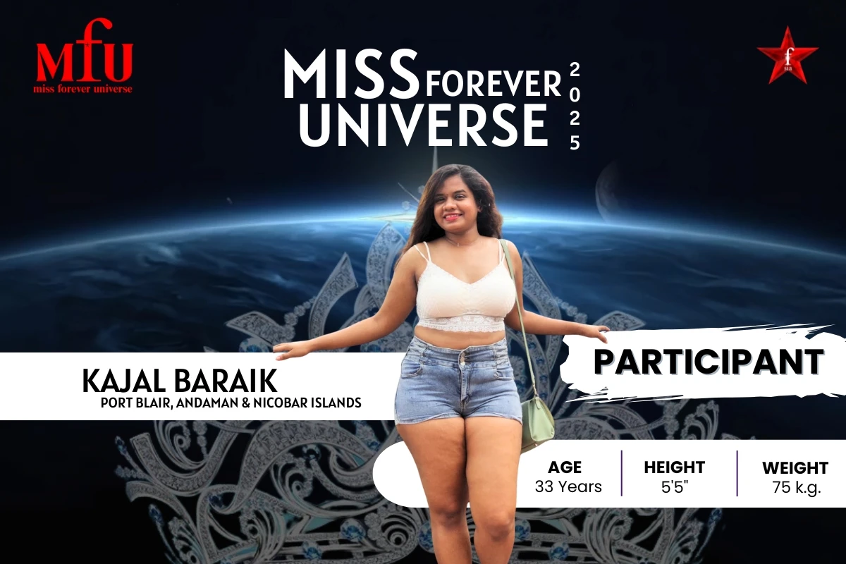 Kajal Baraik, a proud representative of Port Blair and native of the tranquil Andaman & Nicobar Islands, is competing in Forever Miss Universe 2025. She is currently based in Hyderabad and pursues her passion for self-improvement and empowerment while working for an MNC. According to Kajal, genuine beauty resides in self-assurance, compassion, and encouraging others to pursue their dreams. She hopes to use this platform to inspire others to embrace their individuality, spread positivity, and have the courage and tenacity to pursue their dreams.
