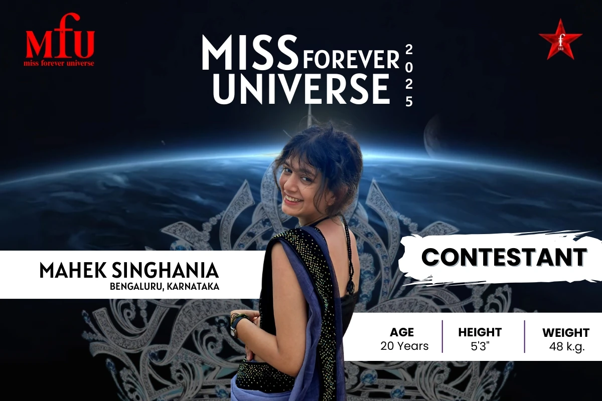 Bengaluru's representative at Forever Miss Universe 2025, Mahek Singhania, was born in Kolkata and is currently working toward an M.Sc. in Clinical Psychology. She is a Kolkata born graduate of Applied Psychology who skillfully combines creativity and intelligence. Mahek, who is passionate about literature, film, music, and art, sees fashion as a storytelling medium. She is a strong voice of ambition and self-expression who aspires to represent India abroad and start her own brand with poise, confidence, and curiosity.