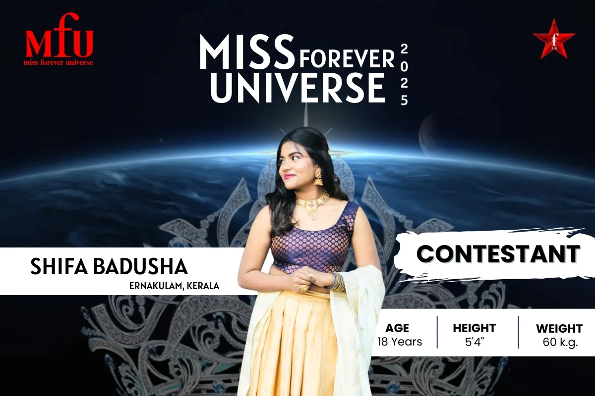 Shifa Badusha, representing Ernakulam as an official Miss Universe 2025 contestant, is a dynamic young performer whose journey blends passion, creativity, confidence, and dedication. Born and raised in Kochi, she discovered her love for modeling, dance, music, and acting early in her school years, shaping her identity as one of the most talented and beautiful models in Ernakulam today. Educated at Saraswati Vidya Niketan (2012–2024) and currently pursuing her higher secondary studies at Darul Uloom Higher Secondary School (2024–2026), Shifa balances academic excellence with a flourishing creative career. Her versatility as a model, trained dancer, expressive actor, and soulful singer has helped her connect with audiences across multiple platforms, establishing her as a sought-after fashion model in Ernakulam. Her pageant journey includes winning Face of the Year at Mr. & Miss Teen Super Globe World Finals, the Beautiful Hair Title at Mr. & Miss Teen Kerala Grand Icon, and the Rising Star title at the Teen Super Globe Indian Finals. She has also graced top fashion events such as Vastra’s Designer Night, Star Face of Kerala, and International Fashion Entertainment.
