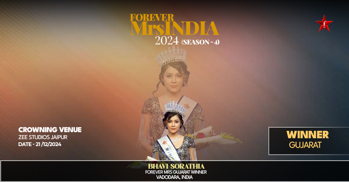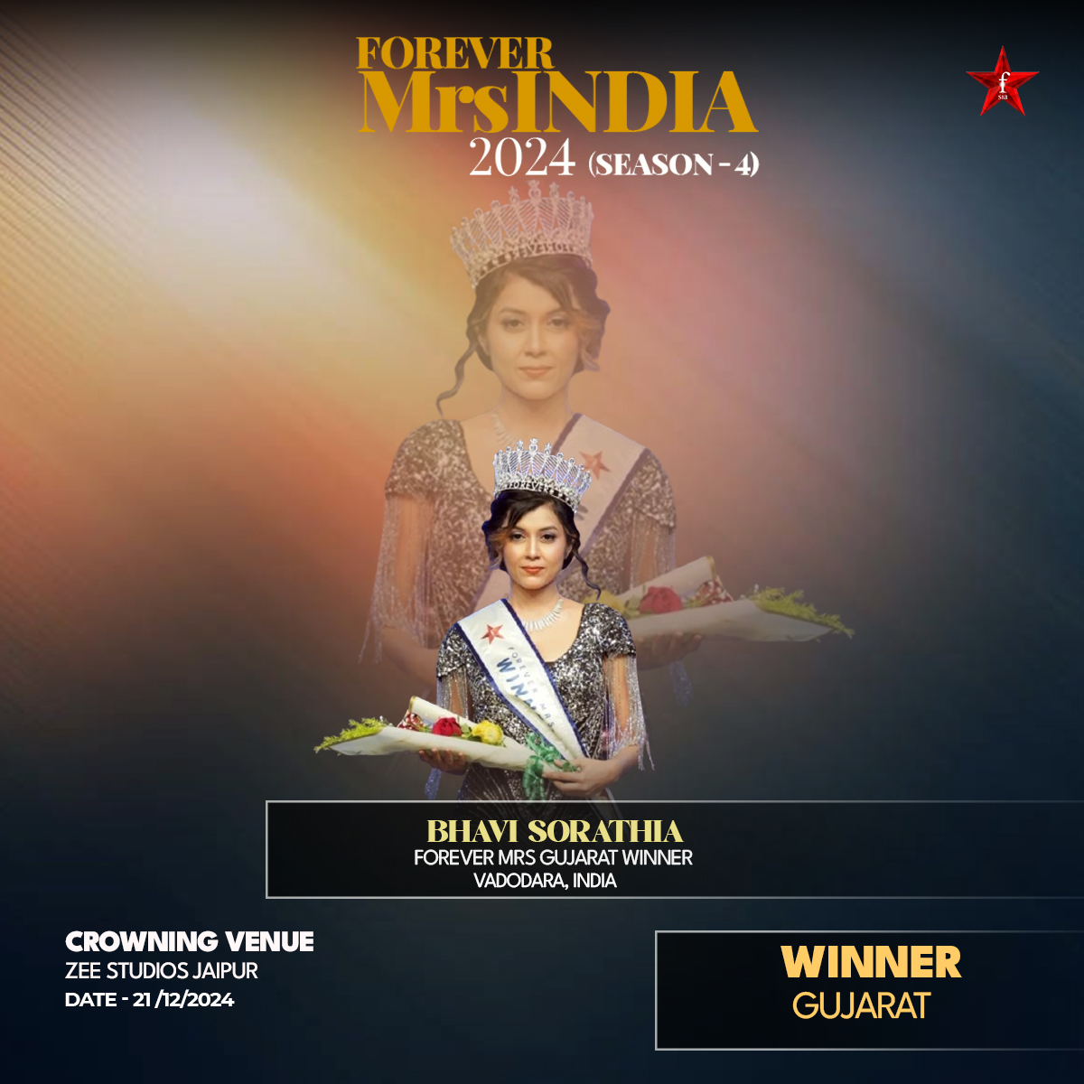 Bhavi Sorathia, a gifted and dedicated businesswoman from Vadodara, Gujarat, was crowned Mrs. India 2024 Gujarat at the Forever Mrs. India National Finale. Her path is proof of unwavering commitment, tenacious self-improvement, and the quest for greatness.Being the proprietor of a creative company, Bhavi enjoys coming up with new ideas, paying attention to details, and providing her clients with state-of-the-art solutions. Her strategy blends creativity and business sense, which makes her endeavor fruitful and significant.As a strong proponent of diligence, self-control, and ongoing development, Bhavi commits herself to lifelong learning. She believes that hard work and persistence, rather than natural talent, are the keys to success.Bhavi Sorathia is an inspirational role model for women all over India, having won the title of Mrs. India 2024 Gujarat.