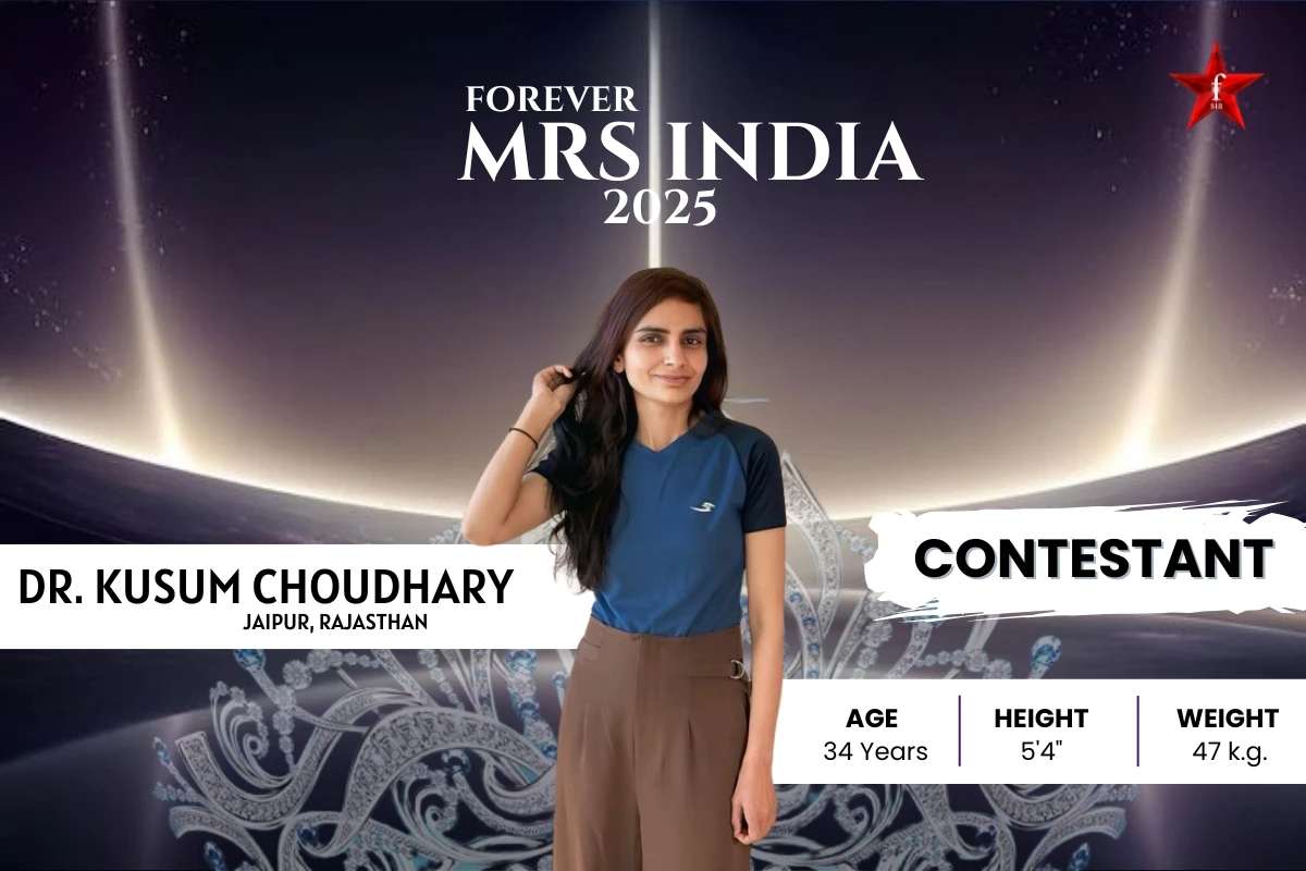 The official Forever Mrs. India 2025 contestant, Kusum Choudhary, is a proud representative of the dynamic and culturally rich city of Jaipur, Rajasthan. She was born in Jhunjhunu into a modest but morally upright middle-class family that taught her to value education and hard work. Her academic background is truly impressive; she obtained her Ph.D. in Zoology from Jai Narain Vyas University in Jodhpur, her Master's in Zoology from IIS University in Jaipur, and her Bachelor of Science from the University of Rajasthan.