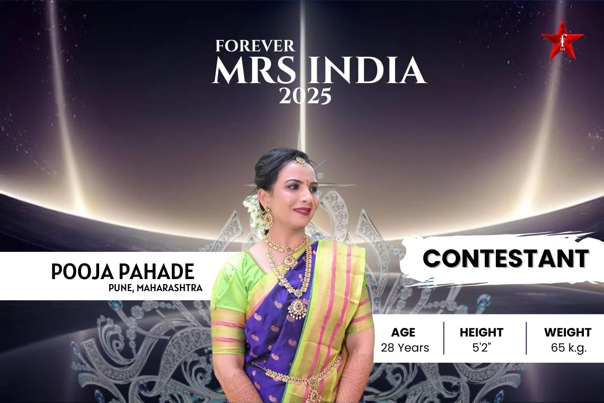 Pooja is making a name for herself in the glitz and fashion industry with her charisma, grace, and strong sense of individuality. She hopes to become a fashion model in Pune and encourage other women to pursue their passions without fear by competing in Forever Mrs. India 2025.