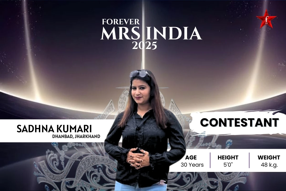As an official Mrs. India 2025 contestant, Sadhana Kumari is a remarkable woman who proudly represents Dhanbad. She is the daughter of Mr. Subhash Sinha and Mrs. Sarita Devi, and was born in Parta Kuhli, Lala Basti, Dhanbad (Jharkhand). Sadhana, who is currently married to Mr. Sudip Ghosh, lives in Hari Narayan Colony, Barmasiya, Dhanbad. She continues to balance her professional and personal goals while working at "Suhagan" in Park Market, Hirapur, Dhanbad.