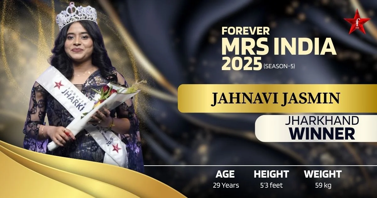 Jahnavi Jasmin, crowned Mrs Jharkhand 2025 (G-1), is a proud representative of Deoghar, Jharkhand, and a celebrated winner under the Forever Star India platform. An accomplished educator, scholar, performer, and role model, she stands as a powerful symbol of intellect, elegance, and empowerment. As a Forever Mrs. India 2025 winner, Jahnavi embodies the spirit of modern Indian womanhood balancing education, ambition, creativity, and personal strength. Her journey reflects courage, self-belief, and the determination to rise beyond limitations placed on women from small towns.