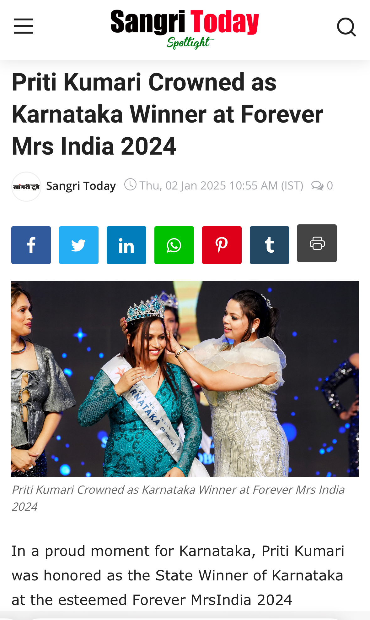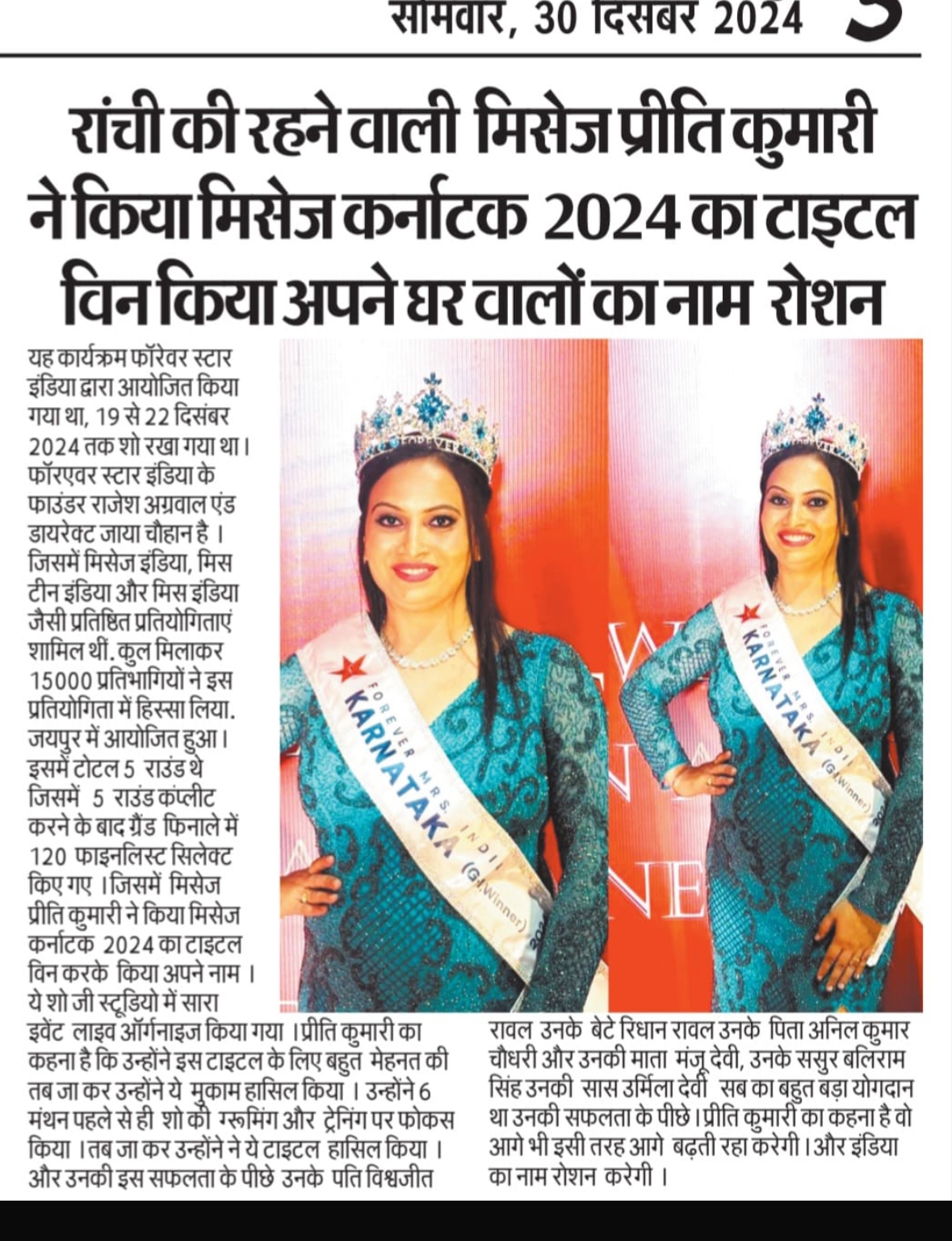 Born on December 2, 1989, Priti Kumari is a model, yoga therapist, award-winning clinical dietitian, and former software engineer. She is well-known for being the winner of Mrs. Karnataka 2024 in the Forever Mrs. India pageant. She embodies a combination of resilience, beauty, and holistic knowledge. With her dedication to wellness, health, and social impact, Priti inspires others by promoting healthier lifestyles via therapeutic yoga and nutrition.