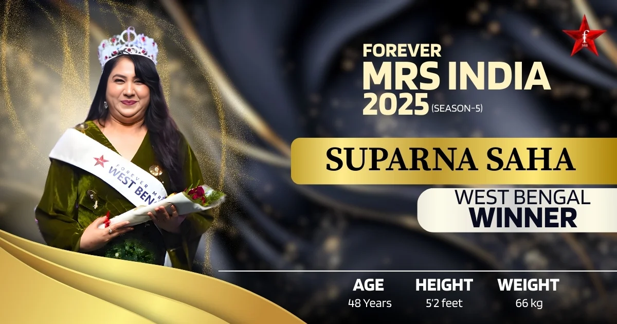 Suparna Saha, crowned Mrs West Bengal 2025, is a poised, confident, and inspiring woman from Kolkata who represents strength, grace, and self-renewal. A proud Forever Star India titleholder, she exemplifies how life experience enhances beauty, confidence, and individuality. Her journey reflects the belief that personal dreams do not have an expiry date. As the winner of Mrs West Bengal 2025, Suparna stands as a beacon of motivation for women who wish to rediscover themselves beyond traditional roles and responsibilities.