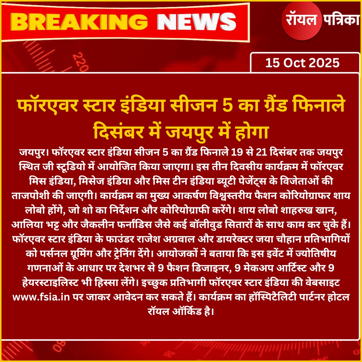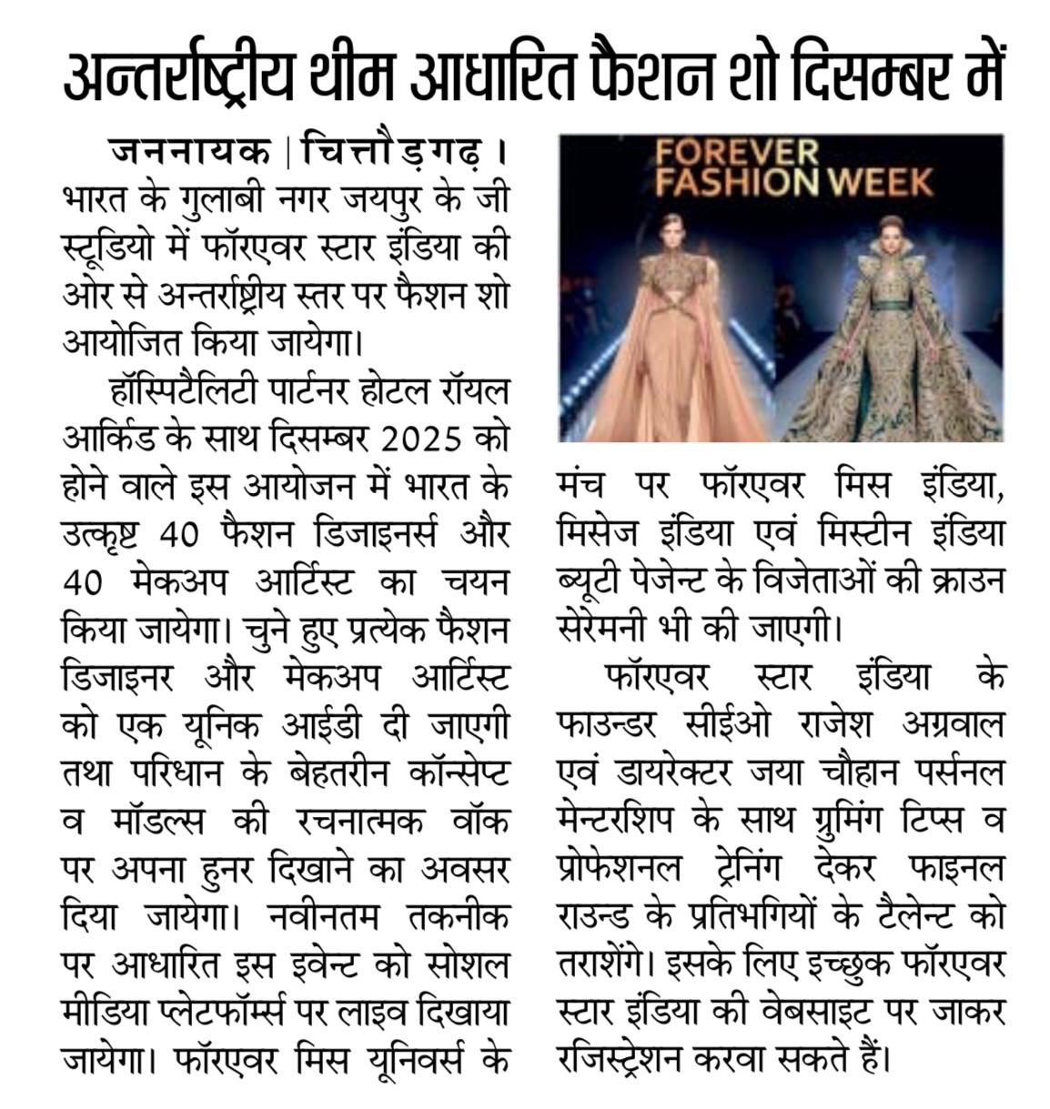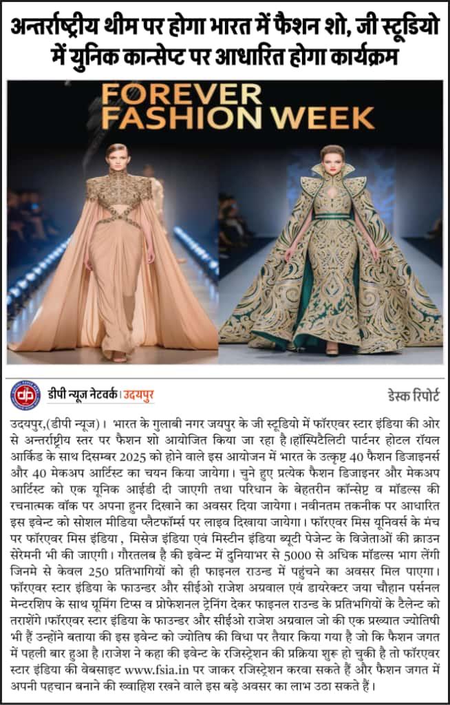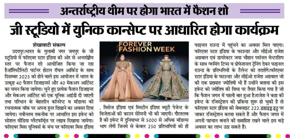 Fashion Week 2024, Grand Finale, and Award Show to be organized from 19th December to 22nd December 2024 in Jaipur