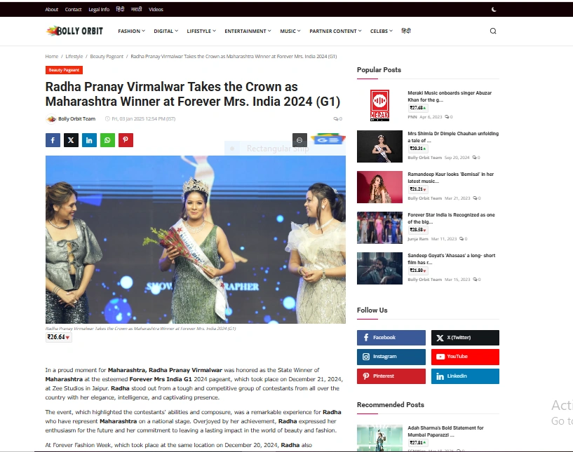 A dedicated dancer and model from Maharashtra, Radha is Mrs. Maharashtra 2024. Her grace and talent are evident on every stage. With the help of her devoted partner Pranay, she is committed to making a significant impact in the fashion and beauty sectors.