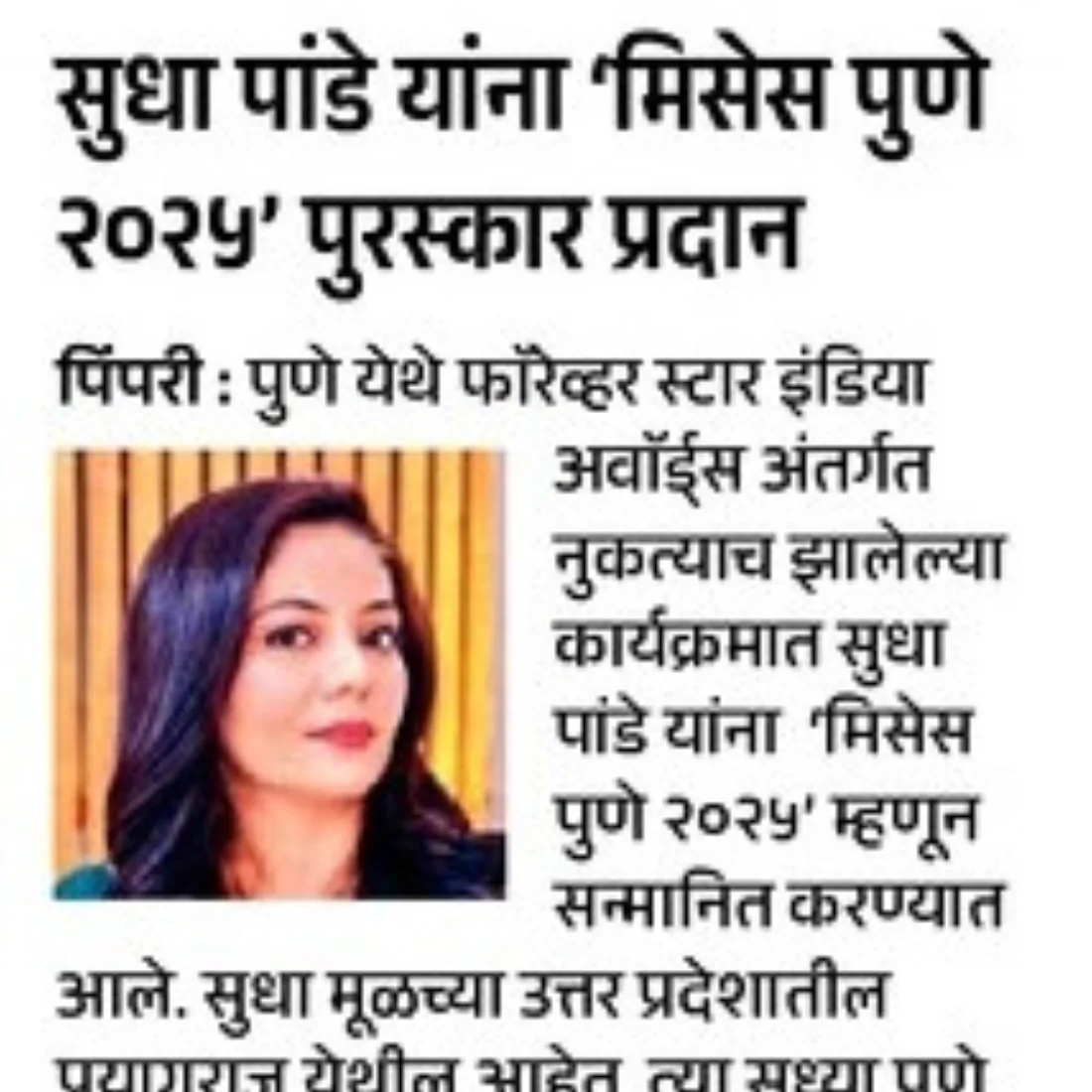 The spiritual and culturally vibrant city of Prayagraj was the starting point of Sudha's journey, where she discovered how to strike a balance between ambition and humility. She was drawn to teaching and self-expression at a young age. She pursued new interests like modeling and public speaking as a result of her commitment to education and her desire for personal development over the years. For her, winning Mrs. Pune 2025 at the Forever Star India is a celebration of bravery, faith, and tenacity rather than just a title. She was able to rediscover herself thanks to FSIA, demonstrating that confidence is the true crown and that dreams are ageless. She continues to encourage other women to rise, shine, and lead with grace as a result of this accomplishment.